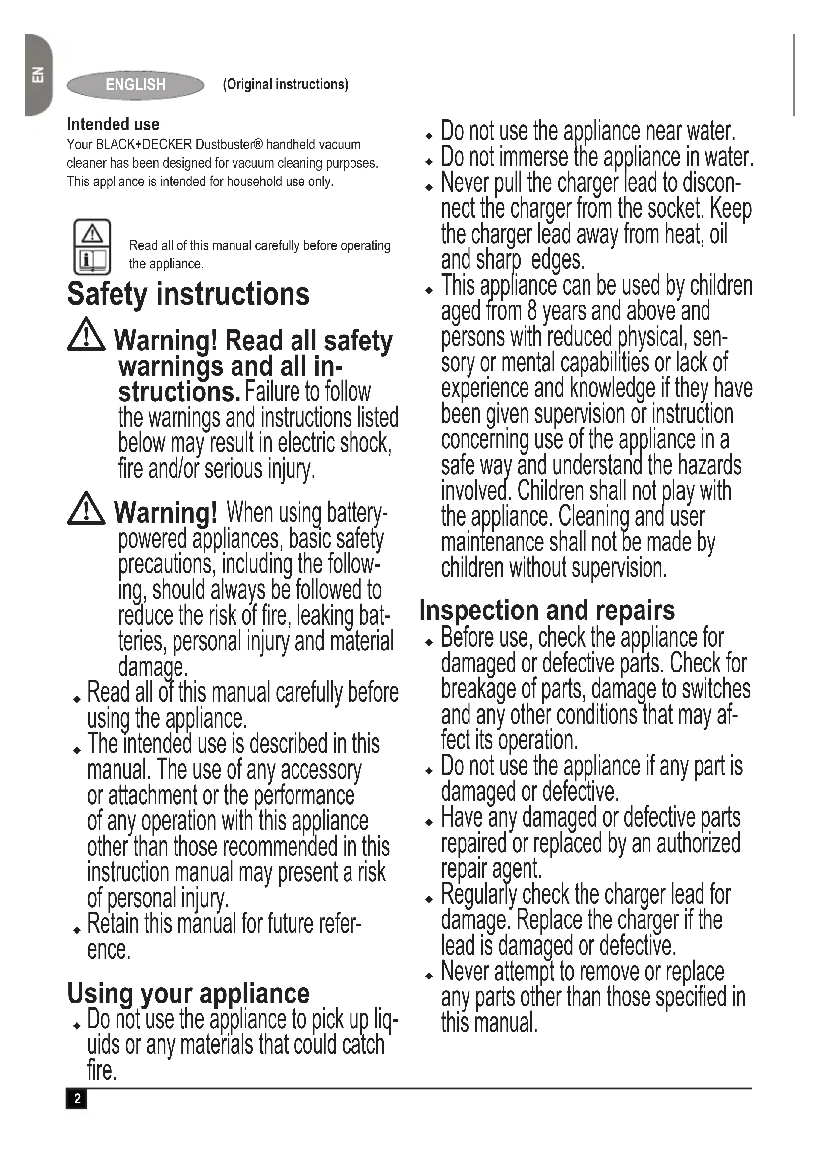 Separate collection of used products and packaging allows materials to be recycled and used again. Re-use of recycled materials helps prevent environ- mental pollution and reduces the demand for raw materials. Local regulations may provide for separate collection of elec- trical products from the household, at municipal waste sites or by the retailer when you purchase a new product. BLACK+DECKER provides a facility for the collection and recycling of BLACK+DECKER products once they have reached the end of their working life. T o take advantage of this service please return your product to any authorised repair agent who will collect them on our behalf. You can check the location of your nearest authorised repair agent by contacting your local BLACK+DECKER office at the address indicated in this manual. Alternatively, a list of authorised BLACK+DECKER repair agents and full details of our after-sales service and contacts are available on the Internet at: www.2helpU.com5 (Übersetzung der ursprünglichen Anweisungen) DEUTSCH ENGLISH (Original instructions) Guarantee Black & Decker is condent of the quality of its products and offers an outstanding guarantee. This guarantee statement is in addition to and in no way prejudices your statutory rights. The guarantee is valid within the territories of the Member States of the European Union and the European Free Trade Area.If a Black & Decker product becomes defective due to faulty materials, workmanship or lack of conformity, within 24 months from the date of purchase, Black & Decker guarantees to replace defective parts, repair products subjected to fair wear and tear or replace such products to ensure minimum inconvenience to the customer unless:u The product has been used for trade, professional or hire purposes;u The product has been subjected to misuse or neglect;u The product has sustained damage through foreign objects, substances or accidents;u Repairs have been attempted by persons other than authorised repair agents or Black & Decker service staff.To claim on the guarantee, you will need to submit proof of purchase to the seller or an authorised repair agent. You can check the location of your nearest authorised repair agent by contacting your local Black & Decker ofce at the address indicated in this manual. Alternatively, a list of authorised Black & Decker repair agents and full details of our after-sales service and contacts are available on the Internet at: www.2helpU.comPlease visit our website www.blackanddecker.co.uk to register your new Black & Decker product and to be kept up to date on new products and special offers. Further information on the Black & Decker brand and our range of products is available at www.blackanddecker.co.ukDo not forget to register your product!www.blackanddecker.co.uk/productregistration Register your product online at www.blackanddecker.co.uk/productreg-istration or send your name, surname and product code to Black & Decker in your country. Bestimmungsgemäße Verwendung Der Handstaubsauger BLACK+DECKER Dustbuster® wurde zum Saugen von Schmutz entwickelt. Dieses Gerät ist nicht für den gewerblichen Einsatz vorgesehen.Lesen Sie diese Anleitung vollständig und aufmerksam durch, bevor Sie das Gerät verwenden. Sicherheitshinweise