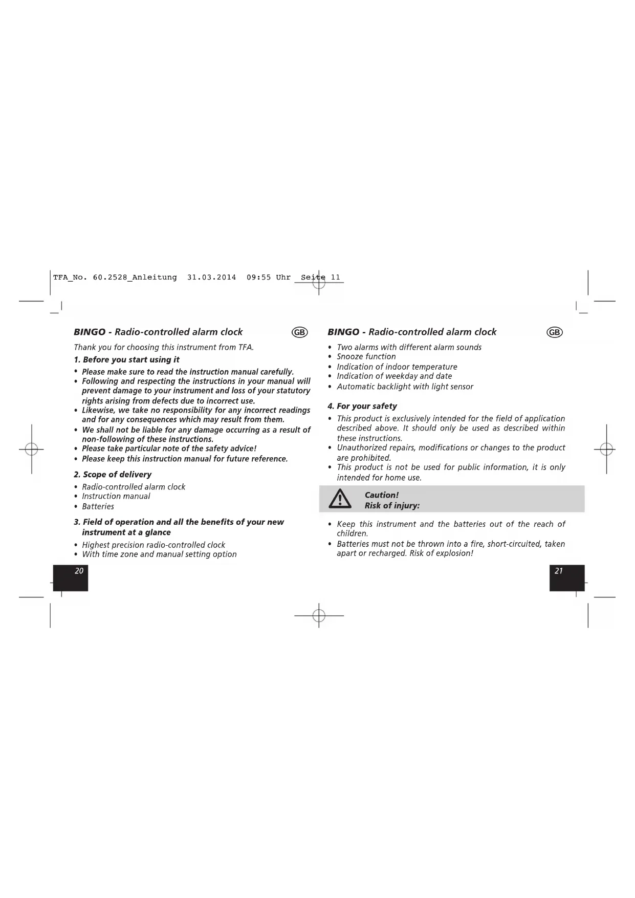 This product has been manufactured using high-grade materials and components which can be recycled and reused. Never dispose of empty batteries and rechargeable batteries in household waste. As a consumer, you are legally required to take them to your retail store or to an appropriate collection site depending on national or local regulations in order to protect the environment. The symbols for the heavy metals contained are: Cd=cadmium, Hg=mercury, Pb=lead This instrument is labelled in accordance with the EU Waste Electrical and Electronic Equipment Directive (WEEE). Please do not dispose of this instrument in household waste. The user is obligated to take end-of-life devices to a designated collection point for the dis- posal of electrical and electronic equipment, in order to ensure environmentally-compatible disposal. TFA_No. 60.2528_Anleitung 31.03.2014 09:55 Uhr Seite 173534 BINGO - Radio-controlled alarm clock