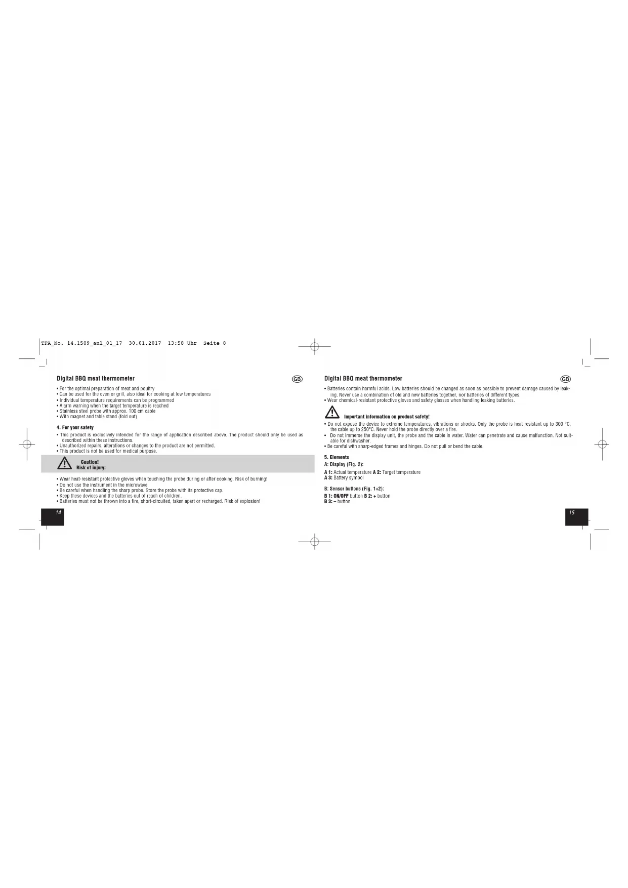 This product has been manufactured using high-grade materials and components which can be recycled and reused. Never dispose of empty batteries and rechargeable batteries with ordinary household waste. As a consumer, you are required by law to take them to your retail store or to an appropriate collection site depending on national or local regulations in order to protect the environment. The symbols for the contained heavy metals are: Cd = cadmium, Hg = mercury, Pb = lead This product is labelled in accordance with the EU Waste Electrical and Electronic Equipment Directive (WEEE). Please do not dispose of this product in ordinary household waste. As a consumer, you are required to take end-of-life devices to a designated collection point for the disposal of electrical and electronic equipment, in order to ensure environmentally-compatible disposal. TFA_No. 14.1509_anl_01_17 30.01.2017 13:58 Uhr Seite 102120 Digital BBQ meat thermometer