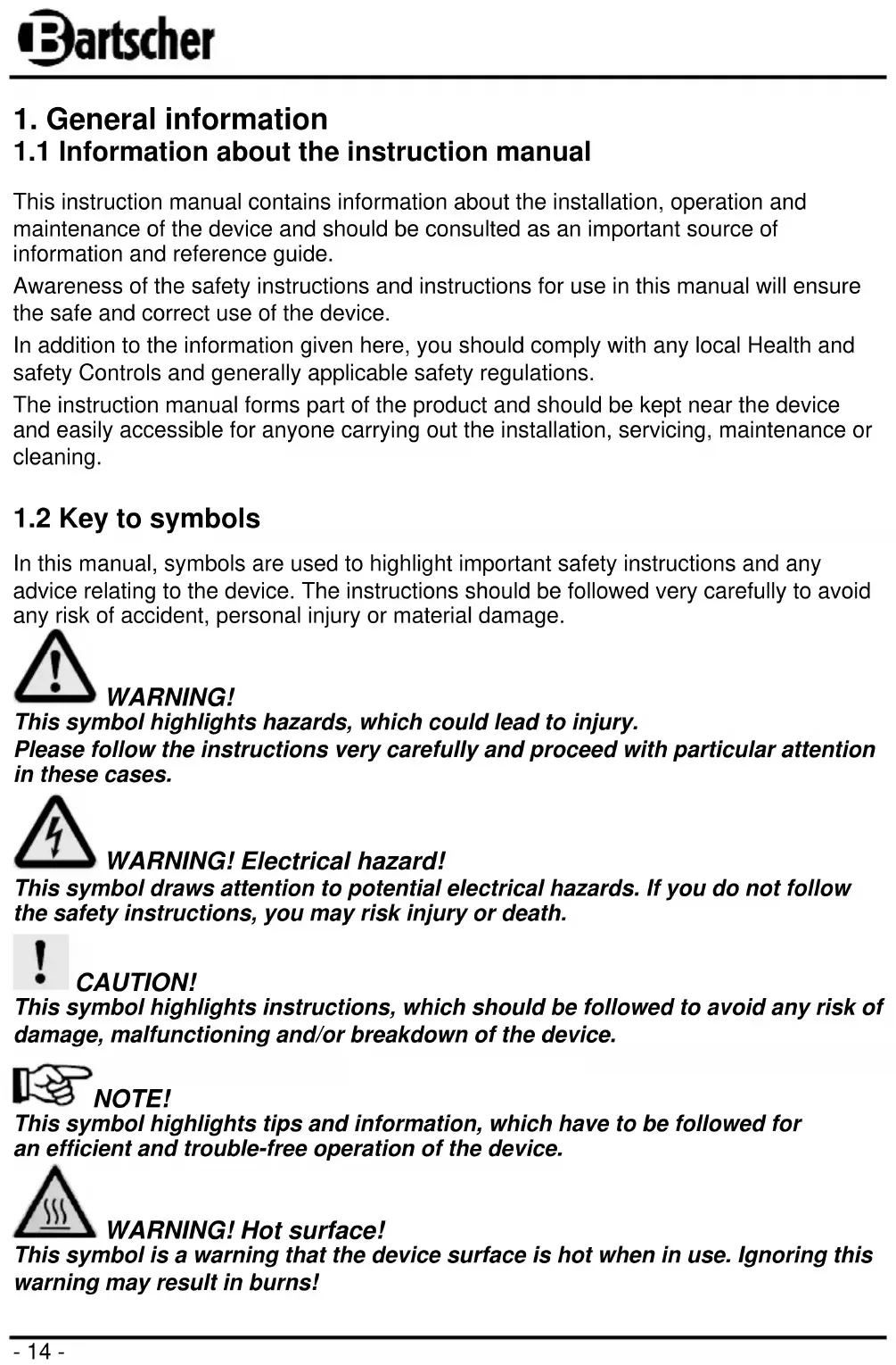 In this manual, symbols are used to highlight important safety instructions and any advice relating to the device. The instructions should be followed very carefully to avoid any risk of accident, personal injury or material damage. WARNING! This symbol highlights hazards, which could lead to injury. Please follow the instructions very carefully and proceed with particular attention in these cases. WARNING! Electrical hazard! This symbol draws attention to potential electrical hazards. If you do not follow the safety instructions, you may risk injury or death. CAUTION! This symbol highlights instructions, which should be followed to avoid any risk of damage, malfunctioning and/or breakdown of the device. NOTE! This symbol highlights tips and information, which have to be followed for an efficient and trouble-free operation of the device. WARNING! Hot surface! This symbol is a warning that the device surface is hot when in use. Ignoring this warning may result in burns!- 15 -
