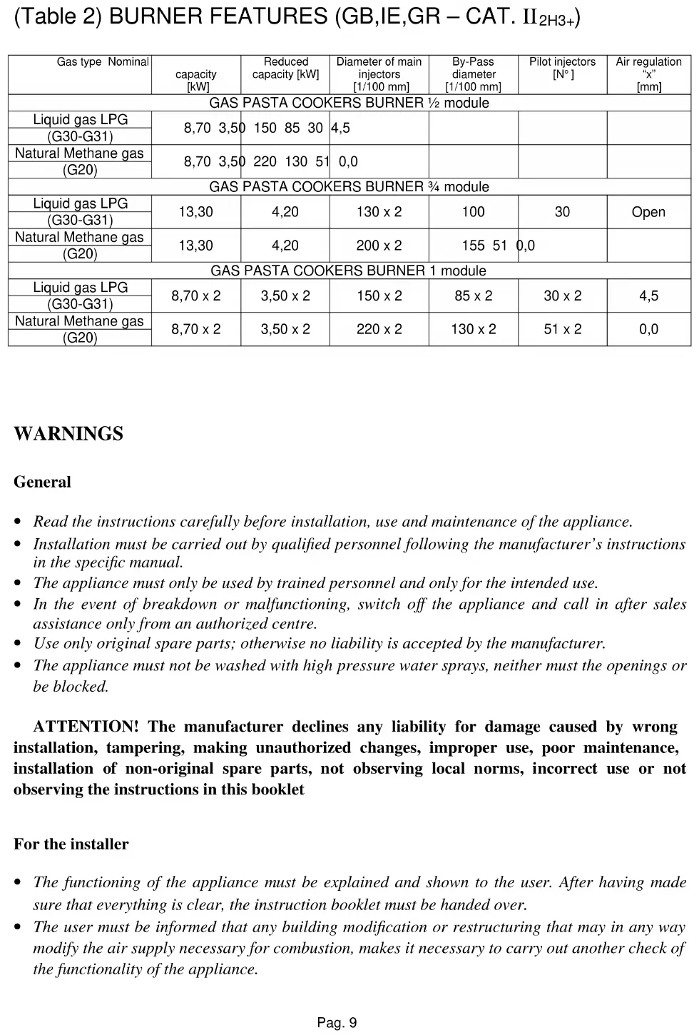 Gas type Nominal capacity [kW] Reduced capacity [kW] Diameter of main injectors [1/100 mm] By-Pass diameter [1/100 mm] Pilot injectors [N°] Air regulation “x” [mm] GAS PASTA COOKERS BURNER ½ module Liquid gas LPG (G30-G31) 8,70 3,50 150 85 30 4,5 Natural Methane gas (G20) 8,70 3,50 220 130 51 0,0 GAS PASTA COOKERS BURNER ¾ module Liquid gas LPG (G30-G31) 13,30 4,20 130 x 2 100 30 Open Natural Methane gas (G20) 13,30 4,20 200 x 2 155 51 0,0 GAS PASTA COOKERS BURNER 1 module Liquid gas LPG (G30-G31) 8,70 x 2 3,50 x 2 150 x 2 85 x 2 30 x 2 4,5 Natural Methane gas (G20) 8,70 x 2 3,50 x 2 220 x 2 130 x 2 51 x 2 0,0Pag. 10 TECHNICAL FEATURES The following instructions for starting up and functioning refer to gas and mixed appliances belonging to category I 3B/P , II 2H3+ , II 2H3B/P , II 2L3B/P , III 1ab2H3B/P , III 1a2H3B/P with a power pressure for Butane (G30) of 28/30mbar, for propane (G31) of 30/37 mbar, for Methane (Natural Gas) (G20- G25) of 20/25 mbar and for town gases (G110 – G120) of 8 mbar. The data plate (fig. 6 – pag. 4) with all the information to refer to regarding the appliance, is situated inside the right or left side of the control panel, depending on the model. The appliances have been checked in accordance with the European norms below. 2006/95/CE - Low Tension (LVD) CEE 2004/108 - Electromagnetic Compatibility (EMC) 90/396/EEC - Gas Appliances 98/37/EC - Appliance to the directives And the particular reference norms. Declaration of compliance The manufacturer declares that the appliances of their production are compliant with the above mentioned EEC norms and requires that installation be done observing the norms in force, particularly regarding the system for letting out fumes and air exchange.