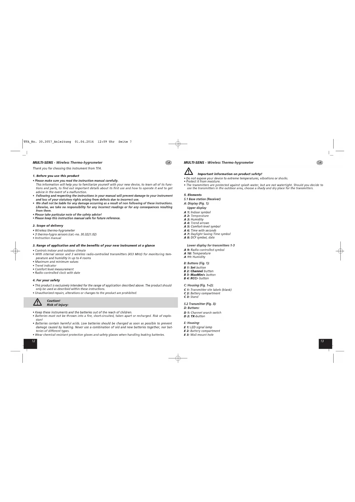- If the clock cannot detect the DCF-signal (e.g. due to interference, transmitting distance, etc.), the time can be set manually. The DCF reception symbol disappears and the clock will then work as a normal quartz clock (see: Manual settings). TFA_No. 30.3057_Anleitung 01.04.2016 12:09 Uhr Seite 81716 MULTI-SENS - Wireless Thermo-hygrometer