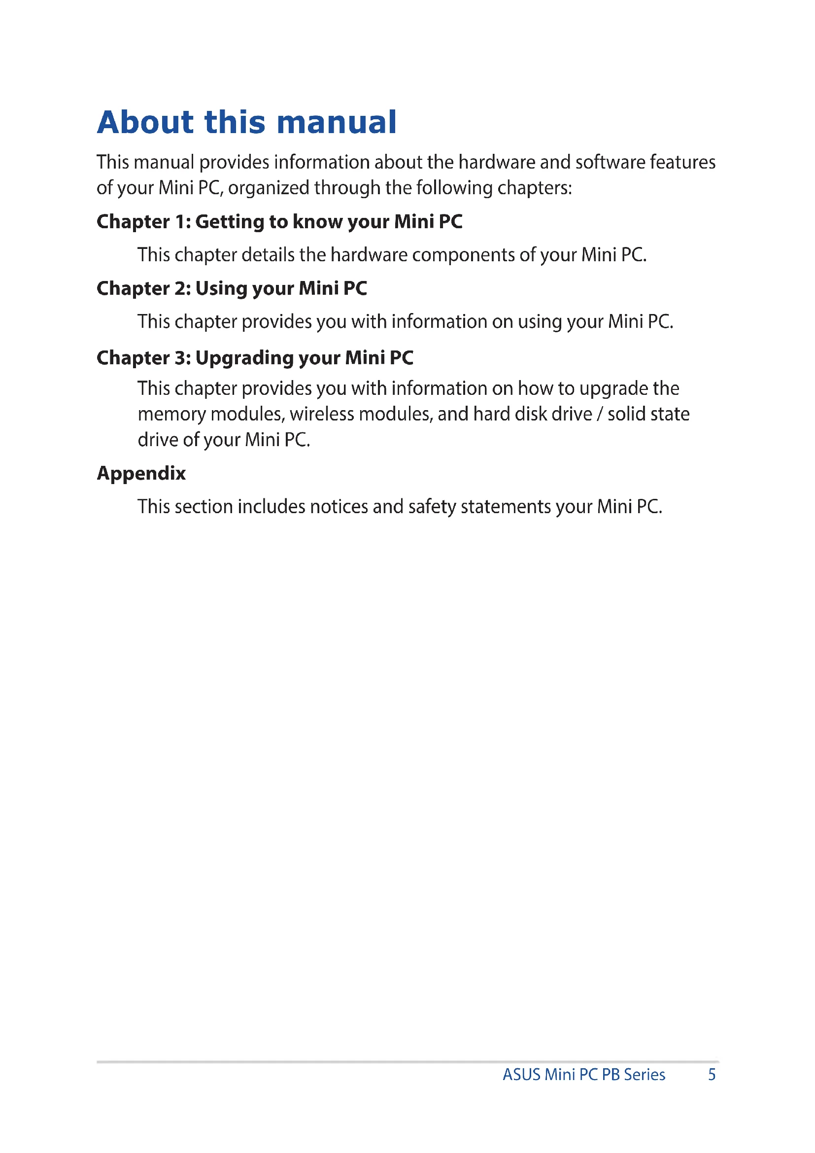 This manual provides information about the hardware and software features of your Mini PC, organized through the following chapters: