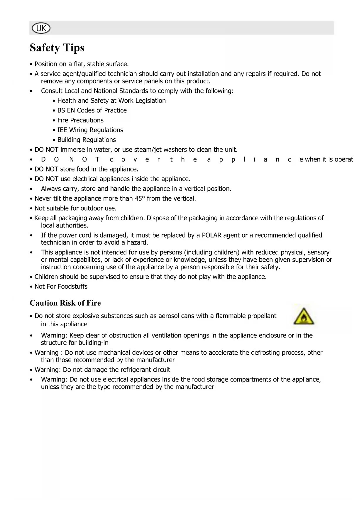 - Warning: Do not use electrical appliances inside the food storage compartments of the appliance, unless they are the type recommended by the manufacturerUK Telephone Helpline: 0845 146 2887 (United Kingdom) Product Description Introduction Please take a few moments to carefully read through this manual. Correct maintenance and operation of this machine will provide the best possible performance from your POLAR product. Pack Contents The following is included: POLAR prides itself on quality and service, ensuring that at the time of packaging the contents are supplied fully functional and free of damage. Should you find any damage as a result of transit, please contact your POLAR dealer immediately. Installation