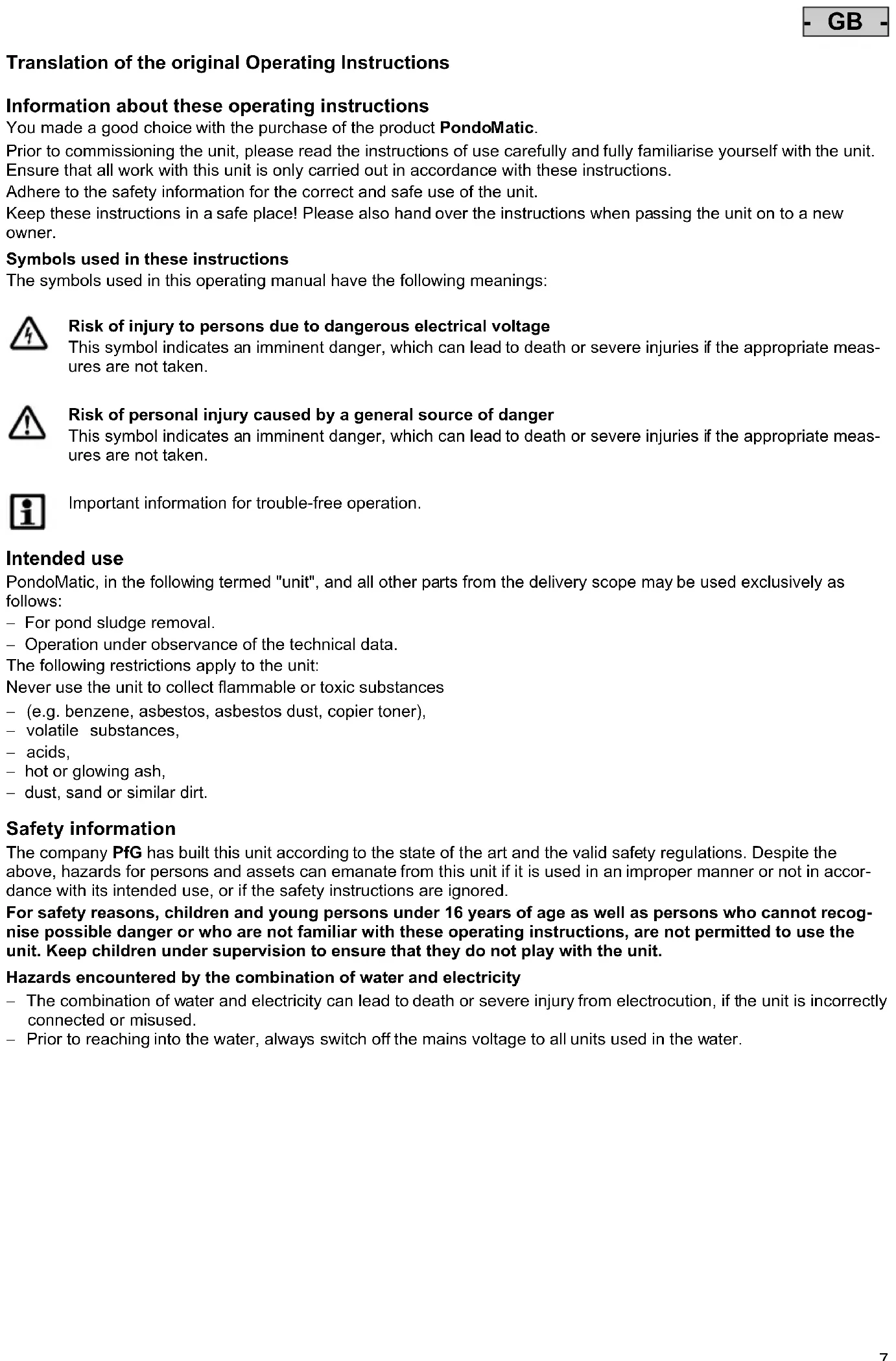 The company PfG has built this unit according to the state of the art and the valid safety regulations. Despite the above, hazards for persons and assets can emanate from this unit if it is used in an improper manner or not in accordance with its intended use, or if the safety instructions are ignored.