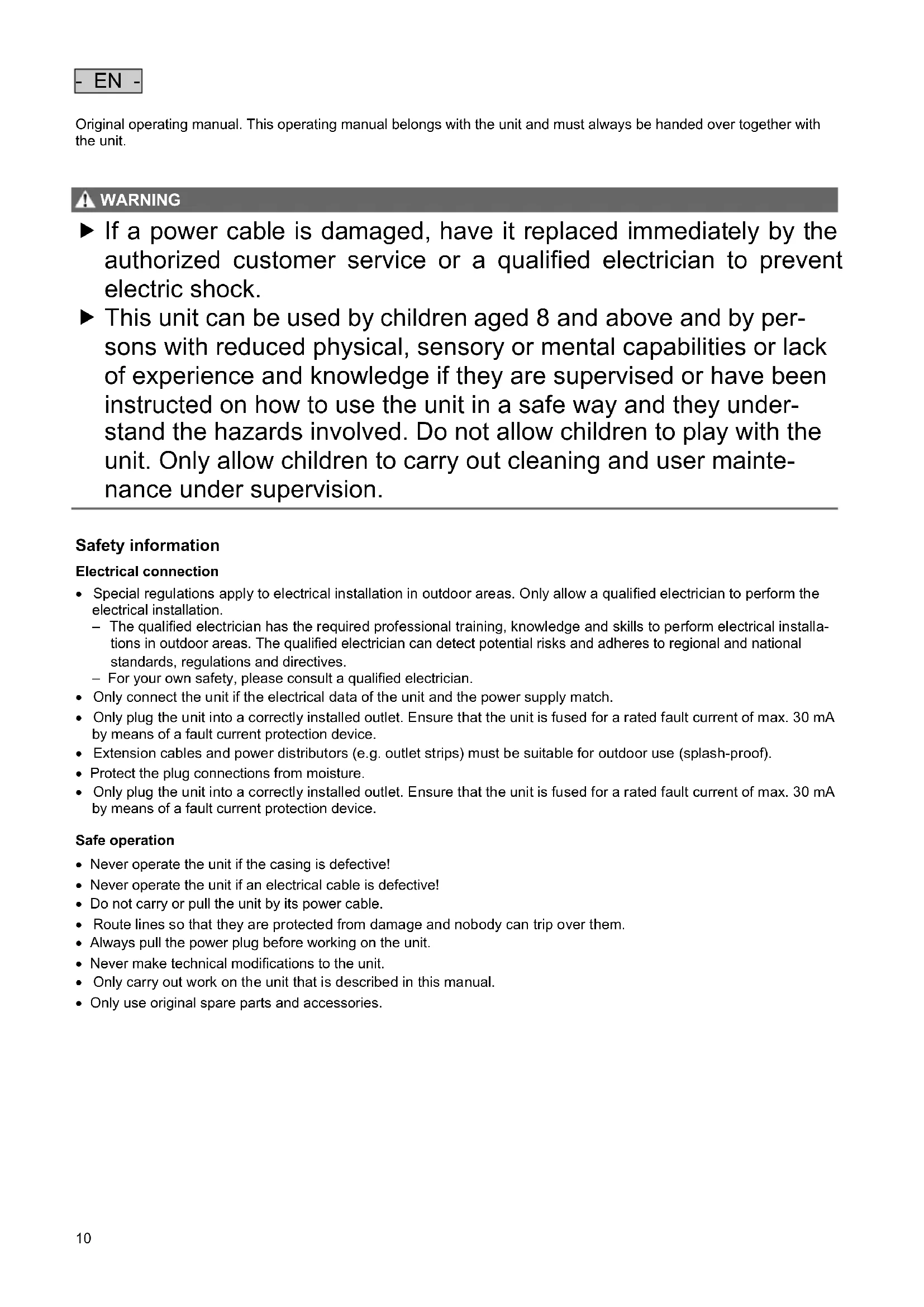 - Never operate the unit if an electrical cable is defective!