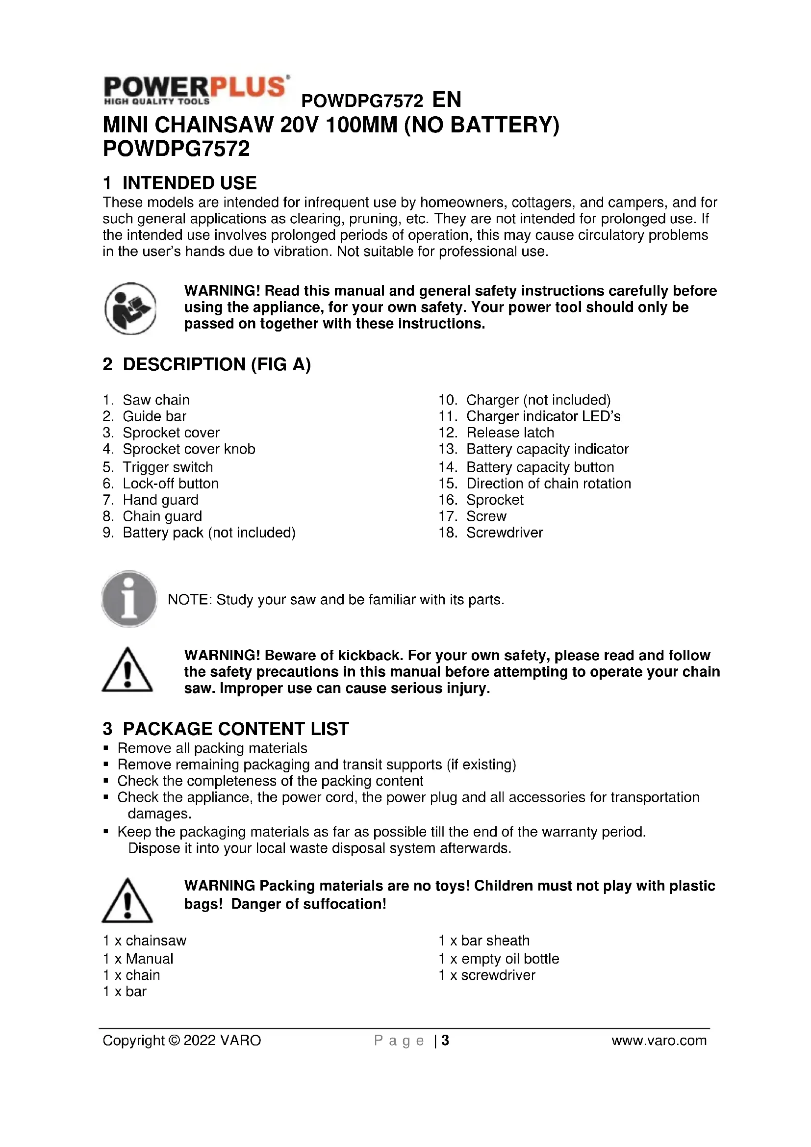 - Never starve the bar and chain of lubricating oil. Running the saw dry or with too little oil will decrease cutting efficiency, shorten saw chain life, cause rapid dulling of chain, and lead to excessive wear of bar from overheating. Too little oil is evidenced by smoke or bar discoloration. 14 TECHNICAL DATA Model: POWDPG7572 Voltage 20V Blade length 100mm Bar cutting length 90mm Chain pitch 7,6mm (0,30”) Chain gauge 1,1mm (0,043”) Drive sprocket 6 teeth 15 NOISE Noise values measured according to relevant standard. (K=3) Acoustic pressure level LpA 77 dB(A) Acoustic power level LwA 88 dB(A) ATTENTION! Wear hearing protection when sound pressure is over 85 dB(A) aw (Vibration) 2,5 m/s² K = 1,5 m/s²POWDPG7572 EN Copyright © 2022 VARO P a g e | 13 www.varo.com 16 WARRANTY
