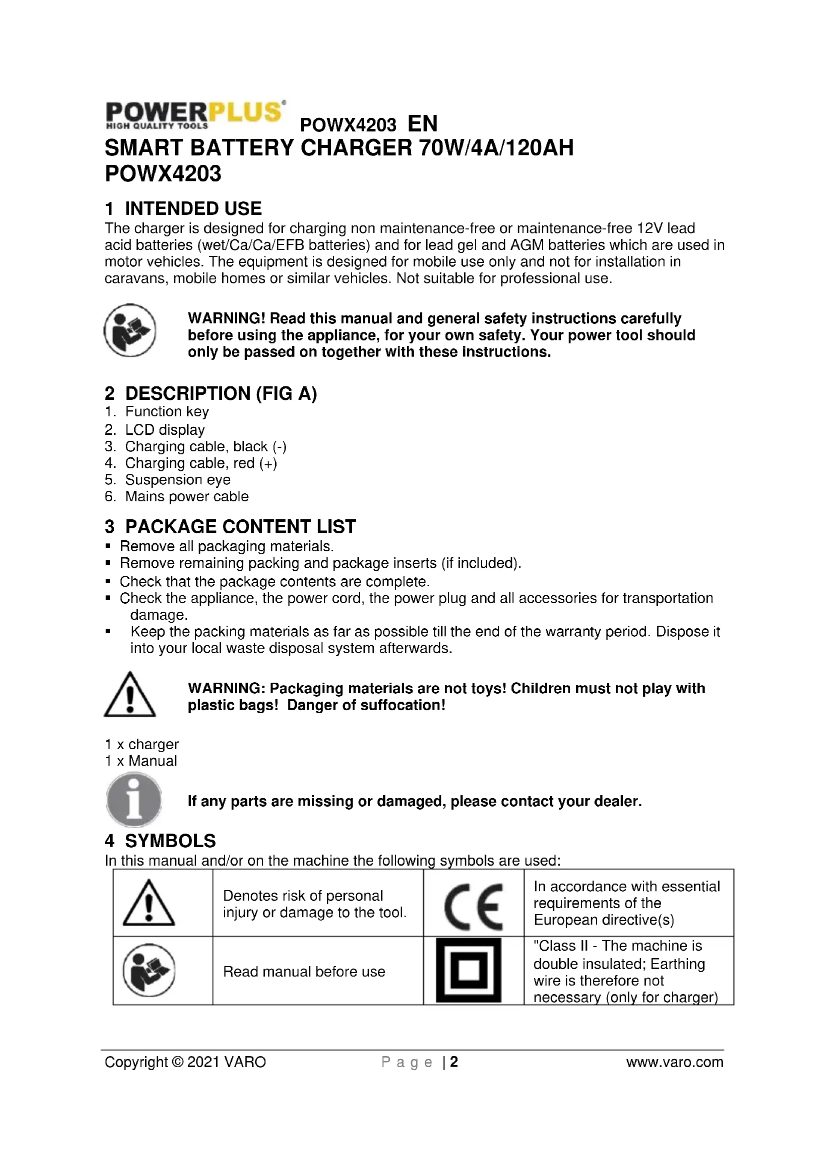 Recond charging program 15.3V DC/1.5A Ambient temperature -20°C – 40°C Battery capacity STD/AGM/Winter 3-120Ah Battery capacity “maintain mode” (max.1A) 3-32Ah 9 ENVIRONMENT Should your appliance need replacement after extended use, do not dispose of it with the household refuse, but in an environmentally safe way. Waste produced by electrical machine items should not be handled like normal household rubbish. Please recycle where recycle facilities exist. Check with your Local Authority or retailer for recycling advice.POWX4203 EN Copyright © 2021 VARO P a g e | 9 www.varo.com 10 CONFORMITEITSVERKLARING VARO – Vic. Van Rompuy N.V. – Joseph Van Instraat 9 – 2500 Lier – Belgium, declares that, product Battery charger trade mark PowerPlus model POWX4203 is in conformity with the essential requirements and other relevant provisions of the applicable European Directives, based on the application of European harmonized standards. Any unauthorized modification of the apparatus voids this declaration. European Directives (including, if applicable, their amendments up to the date of signature); 2011/65/EU 2014/30/EU 2014/35/EU European harmonized standards (including, if applicable, their amendments up to the date of signature); EN60335-1 : 2012 EN60335-2-29 : 2004 EN55014-1 : 2017 EN55014-2 : 2015 EN61000-3-2 : 2014 EN61000-3-3 : 2013 Keeper of the Technical Documentation : Philippe Vankerkhove, VARO Vic. Van Rompuy N.V. The undersigned acts on behalf of the company CEO,