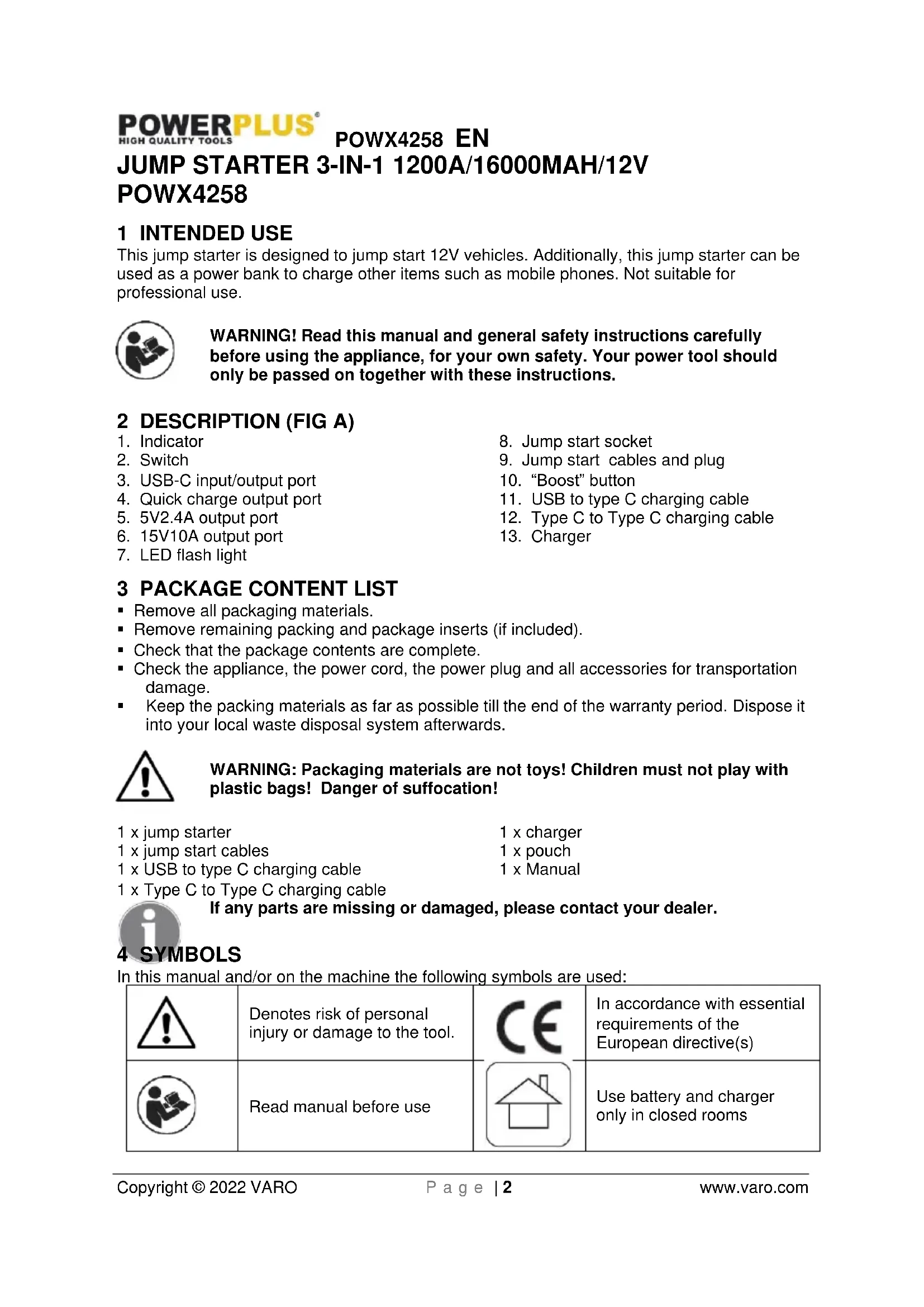 5V/3A (15W) 5V/3A, 9V/2A, 12V/1.5A 5V/2.4A 15V/10A 12V Start current 500A Peak current 1200A Auto-switch off Yes Operating temperatures -20°~60°C 9 ENVIRONMENT Should your appliance need replacement after extended use, do not dispose of it with the household refuse, but in an environmentally safe way. Waste produced by electrical machine items should not be handled like normal household rubbish. Please recycle where recycle facilities exist. Check with your Local Authority or retailer for recycling advice.POWX4258 EN Copyright © 2022 VARO P a g e | 7 www.varo.com
