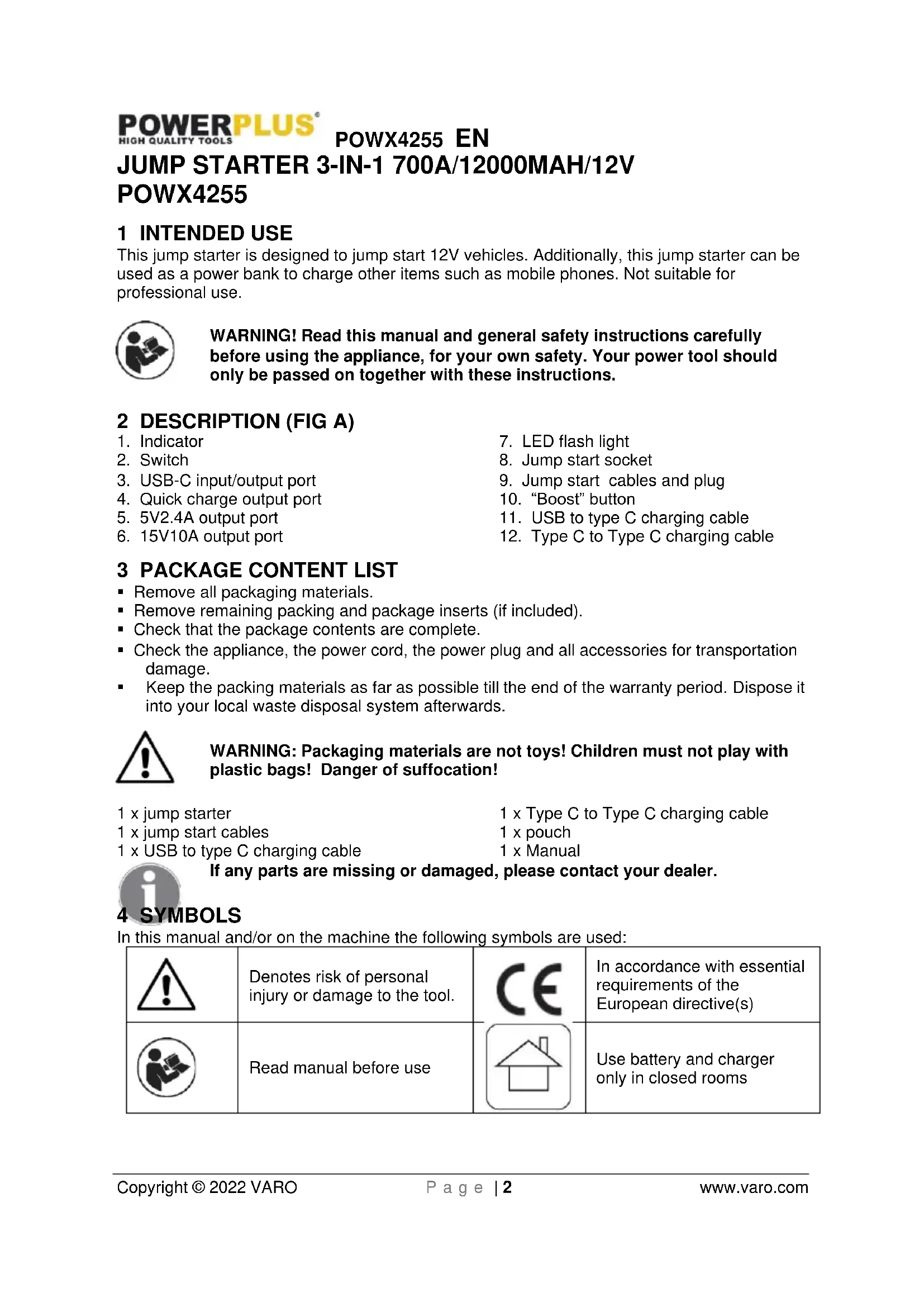 5V/3A (15W) 5V/3A, 9V/2A, 12V/1.5A 5V/2.4A 15V/10A 12V Start current 300A Peak current 700A Auto-switch off Yes Operating temperatures -20°~60°C 9 ENVIRONMENT Should your appliance need replacement after extended use, do not dispose of it with the household refuse, but in an environmentally safe way. Waste produced by electrical machine items should not be handled like normal household rubbish. Please recycle where recycle facilities exist. Check with your Local Authority or retailer for recycling advice.POWX4255 EN Copyright © 2022 VARO P a g e | 7 www.varo.com