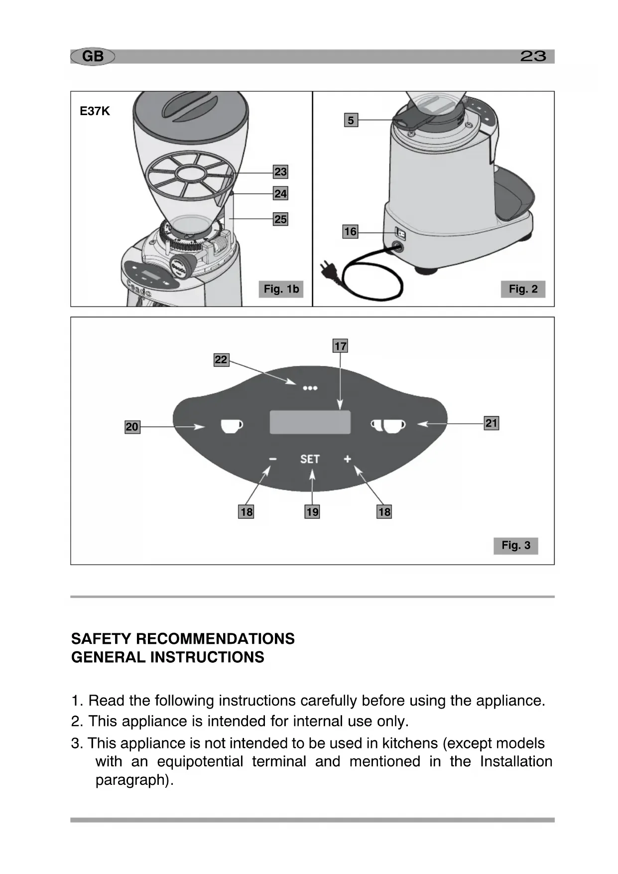 Electronic espresso coffee grinder model E37K is equipped with a removable safety grid (23 Fig. 1b). Before operating the grinder, place the safety grid inside the bean hopper, slotting it into the only position so that the magnetic sensor (24 Fig. 1b) is in contact with the end of the safety arm (25 Fig. 1b). Note: Coffee grinder will not start if safety grid is not properly in place. Any attempt to by-pass the safety device and use the coffee grinder without its safety grid in place may cause personal injury and/or damage to the appliance.37