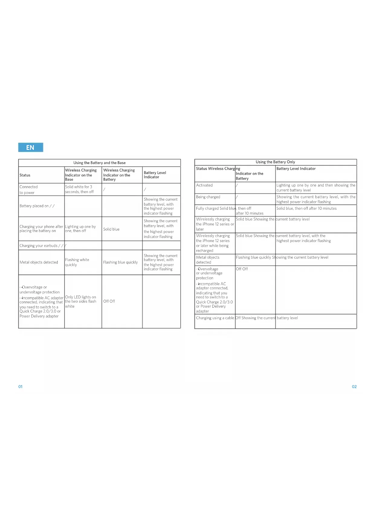 Battery placed on / / Showing the current battery level, with the highest power indicator flashing Charging your phone after placing the battery on Lighting up one by one, then off Solid blue Showing the current battery level, with the highest power indicator flashing Charging your earbuds / / / Metal objects detected Flashing white quickly Flashing blue quickly Showing the current battery level, with the highest power indicator flashing