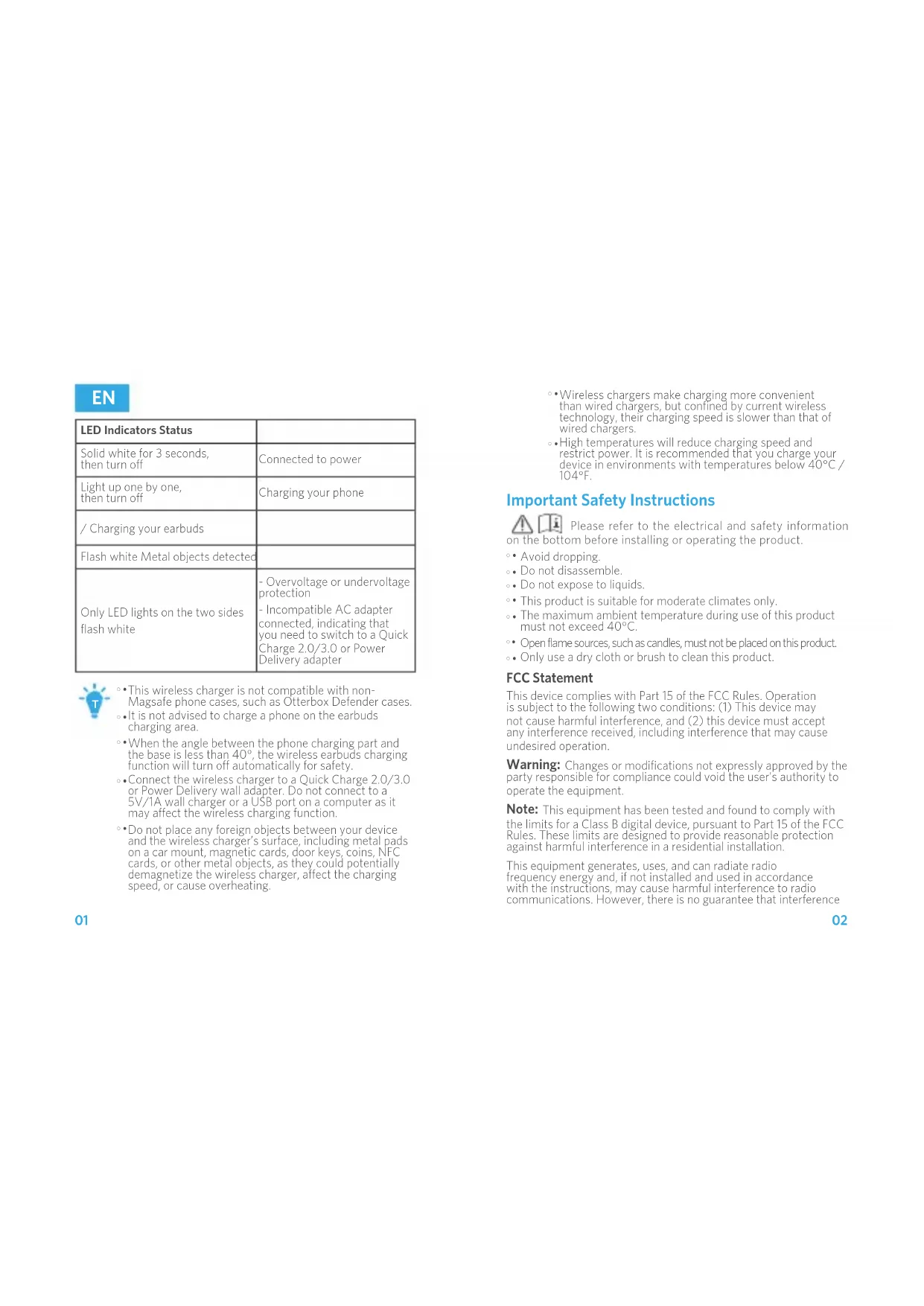 LED Indicators Status Solid white for 3 seconds, then turn off Connected to power Light up one by one, then turn off Charging your phone / Charging your earbuds Flash white Metal objects detected Only LED lights on the two sides flash white - Overvoltage or undervoltage protection - Incompatible AC adapter connected, indicating that you need to switch to a Quick Charge 2.0/3.0 or Power Delivery adapter