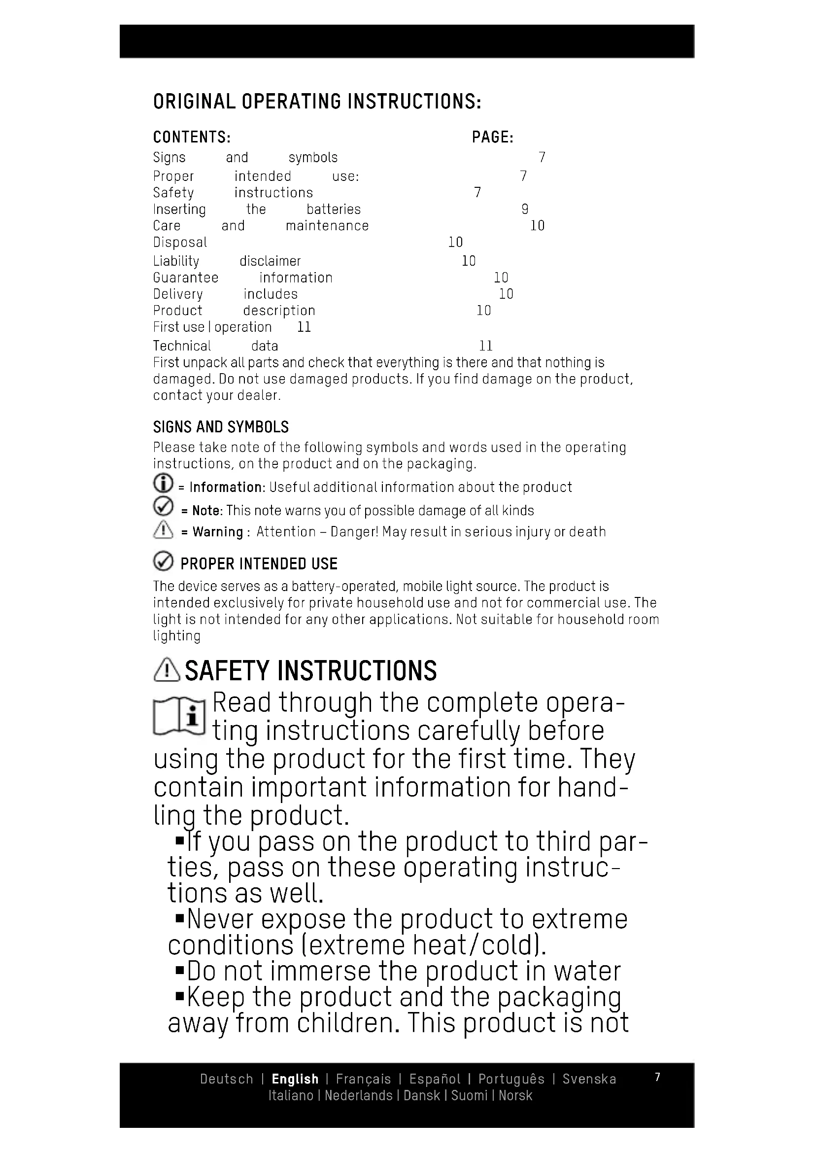 The device serves as a battery-operated, mobile light source. The product is intended exclusively for private household use and not for commercial use. The light is not intended for any other applications. Not suitable for household room lighting SAFETY INSTRUCTIONS Read through the complete opera- ting instructions carefully before using the product for the first time. They contain important information for hand- ling the product. §If you pass on the product to third par- ties, pass on these operating instruc- tions as well. §Never expose the product to extreme conditions (extreme heat/cold). §Do not immerse the product in water §Keep the product and the packaging away from children. This product is not Deutsch | English | Français | Español | Português | Svenska Italiano | Nederlands | Dansk | Suomi | Norsk8 a toy. Children should be supervised in order to ensure that they do not play with the product. §This product is not to be used by per- sons (including children) who have restricted physical, sensory or mental capabilities or who do not have adequa- te experience and knowledge in hand- ling this product. Such persons must be instructed beforehand by a supervisory person who is responsible for their safe- ty or must be supervised during the use of the product!