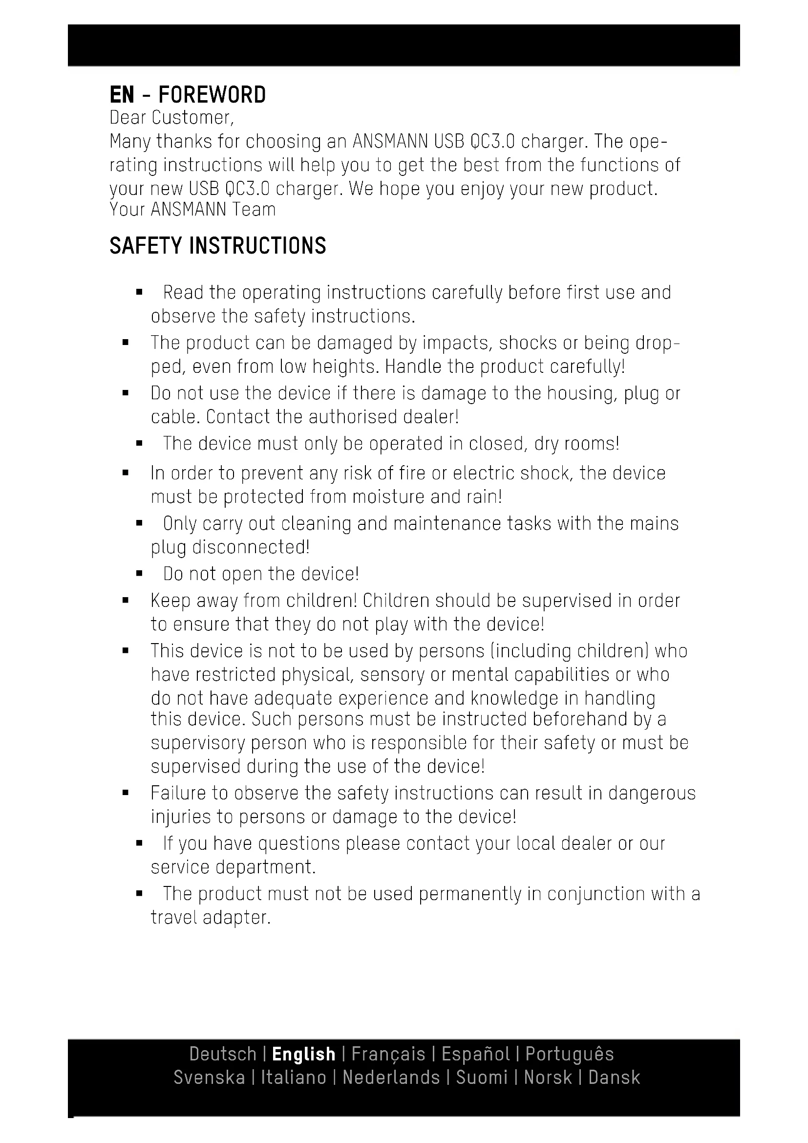 Dear Customer, Many thanks for choosing an ANSMANN USB QC3.0 charger. The ope- rating instructions will help you to get the best from the functions of your new USB QC3.0 charger. We hope you enjoy your new product. Your ANSMANN Team SAFETY INSTRUCTIONS Read the operating instructions carefully before first use and observe the safety instructions. The product can be damaged by impacts, shocks or being drop- ped, even from low heights. Handle the product carefully! Do not use the device if there is damage to the housing, plug or cable. Contact the authorised dealer! The device must only be operated in closed, dry rooms! In order to prevent any risk of fire or electric shock, the device must be protected from moisture and rain! Only carry out cleaning and maintenance tasks with the mains plug disconnected! Do not open the device! Keep away from children! Children should be supervised in order to ensure that they do not play with the device! This device is not to be used by persons (including children) who have restricted physical, sensory or mental capabilities or who do not have adequate experience and knowledge in handling this device. Such persons must be instructed beforehand by a supervisory person who is responsible for their safety or must be supervised during the use of the device! Failure to observe the safety instructions can result in dangerous injuries to persons or damage to the device! If you have questions please contact your local dealer or our service department. The product must not be used permanently in conjunction with a travel adapter. Deutsch | English | Français | Español | Português Svenska | Italiano | Nederlands | Suomi | Norsk | DanskUSE CHARGING DEVICES In order to charge a device, such as a smartphone for example, please use a suitable USB QC3.0 cable or the original charge cable for your device. The USB QC3.0 charger has a USB-A output. Please use a sui- table cable for this. Insert the USB plug of the cable into the USB QC3.0 charger and the other end into your device. The charging process starts automatically. The USB QC3.0 charger has both USB and Qualcomm QC3.0 protocols. In order to be able to use this technology, please check that your end-device is compatible. Simultaneous charging of multiple end-devices is possible with restrictions. This is dependent on the total required charge current and charge voltage. The USB QC3.0 charger switches off automatically once the charging is complete. Please disconnect your device from the USB QC3.0 charger once the charging process is complete. The USB QC3.0 charger may heat up a little depending on the output power required. USE