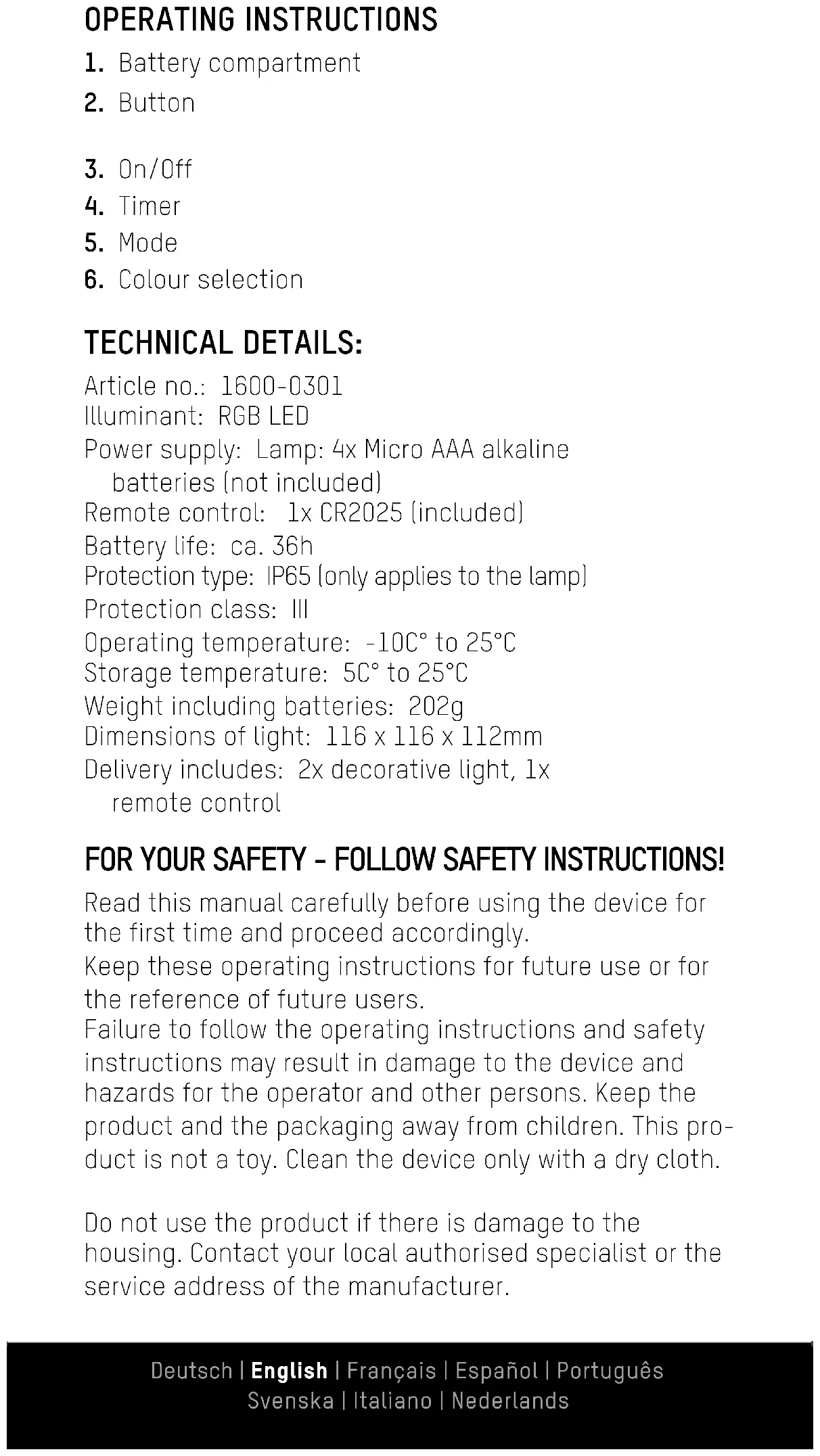 TECHNICAL DETAILS: Article no.: 1600-0301 Illuminant: RGB LED Power supply: Lamp: 4x Micro AAA alkaline batteries (not included) Remote control: 1x CR2025 (included) Battery life: ca. 36h Protection type: IP65 (only applies to the lamp) Protection class: III Operating temperature: -10C° to 25°C Storage temperature: 5C° to 25°C Weight including batteries: 202g Dimensions of light: 116 x 116 x 112mm Delivery includes: 2x decorative light, 1x remote control FOR YOUR SAFETY - FOLLOW SAFETY INSTRUCTIONS! Read this manual carefully before using the device for the first time and proceed accordingly. Keep these operating instructions for future use or for the reference of future users. Failure to follow the operating instructions and safety instructions may result in damage to the device and hazards for the operator and other persons. Keep the product and the packaging away from children. This pro- duct is not a toy. Clean the device only with a dry cloth. Do not use the product if there is damage to the housing. Contact your local authorised specialist or the service address of the manufacturer. Deutsch | English | Français | Español | Português Svenska | Italiano | Nederlands Do not open or modify the product! Repair work shall only be carried out by the manufacturer or by a ser- vice technician appointed by the manufacturer or by a similarly qualified person. Keep the product and the packaging away from children. This product is not a toy. Children should be supervised in order to ensure that they do not play with the product. This product is not to be used by persons (including children) who have restricted physical, sensory or mental capabilities or who do not have adequate experience and knowledge in handling this product. Such persons must be instructed beforehand by a supervisory person who is responsible for their safety or must be supervised during the use of the product! The light-emitting surface must be kept clean. The lamp may only be used in accordance with its intended use. Do not use the lamp in potentially explosive areas and do not expose it to excessive heat. Failure to observe the safety instructions can result in dangerous injuries to persons or damage to the device! PROPER INTENDED USE: Lamp for indoor and outdoor use. Not intended for any other applications. Not suitable for household room lighting. Suitable for extreme physical conditions. FIRST USE: The product has an infrared remote control. The lamp can be turned on and off using either this remote con- trol, or the button on the bottom side of the lamp. The remote control can be used to activate various colours, a 4-hour or 8-hour timer and other functions (colour change).BATTERY REPLACEMENT: Make sure to switch the lamp off before changing the batteries. To change the batteries, unscrew the battery compartment’s sealing cover. Remove the old batteries. Always change all of the batteries at the same time. Insert the new batteries as indicated by the markings in the battery holder. ATTENTION! Take care to observe the polarity markings (+/-) in the battery compartment. Otherwise, there may be a risk that the batteries could become damaged and explode. Ensure that you do not short-circuit the con- tacts. Keep the contacts away from any metal or damp objects when changing the batteries. Then close the battery compartment again. Never attempt to recharge non-rechargeable batteries. Never use new batteries and used batteries together. Use only high-quality batteries of the same type. The use of rechargeable batteries and high-current batteries is not permitted due to other electrical characteristics. In the event that this light will not be used for an extended period of time, ensure that the batteries are removed to avoid damage. Empty batteries must be removed. ENVIRONMENTAL INFORMATION | DISPOSAL: The product should not be discarded in the normal hou- sehold waste under any circumstances. Dispose of the product via an authorised disposal centre or your munici- pal waste disposal facility. Observe the current applicable regulations. Contact your waste disposal facility in the event of any doubt. Dispose of all packaging materials via an environmentally friendly disposal facility. Used batteries and rechargeable batteries are special waste and must be disposed of in accordance with national regulations and not with the normal household waste. LIABILITY DISCLAIMER: The information contained within these operating inst- ructions can be changed without prior notification. ANS- MANN accepts no liability for direct, indirect, incidental or other damage or consequential damage arising though Deutsch | English | Français | Español | Português Svenska | Italiano | Nederlandsimproper handling or through disregard of the information contained within these operating instructions. We accept no liability or warranty claims or guarantee claims in the event of incorrect use of the product. GUARANTEE INFORMATION: The device has a two year guarantee. The guarantee does not apply to damage to the device arising through a failure to comply with the operating instructions. LEGEND: Class 3 equipment Conforms to the European directive Do not look into the lamp Waste Electrical and Electronic Equipment (WEEE Directive) Read the operating instructions carefully before use! Subject to technical changes. We assume no liability for printing errors.