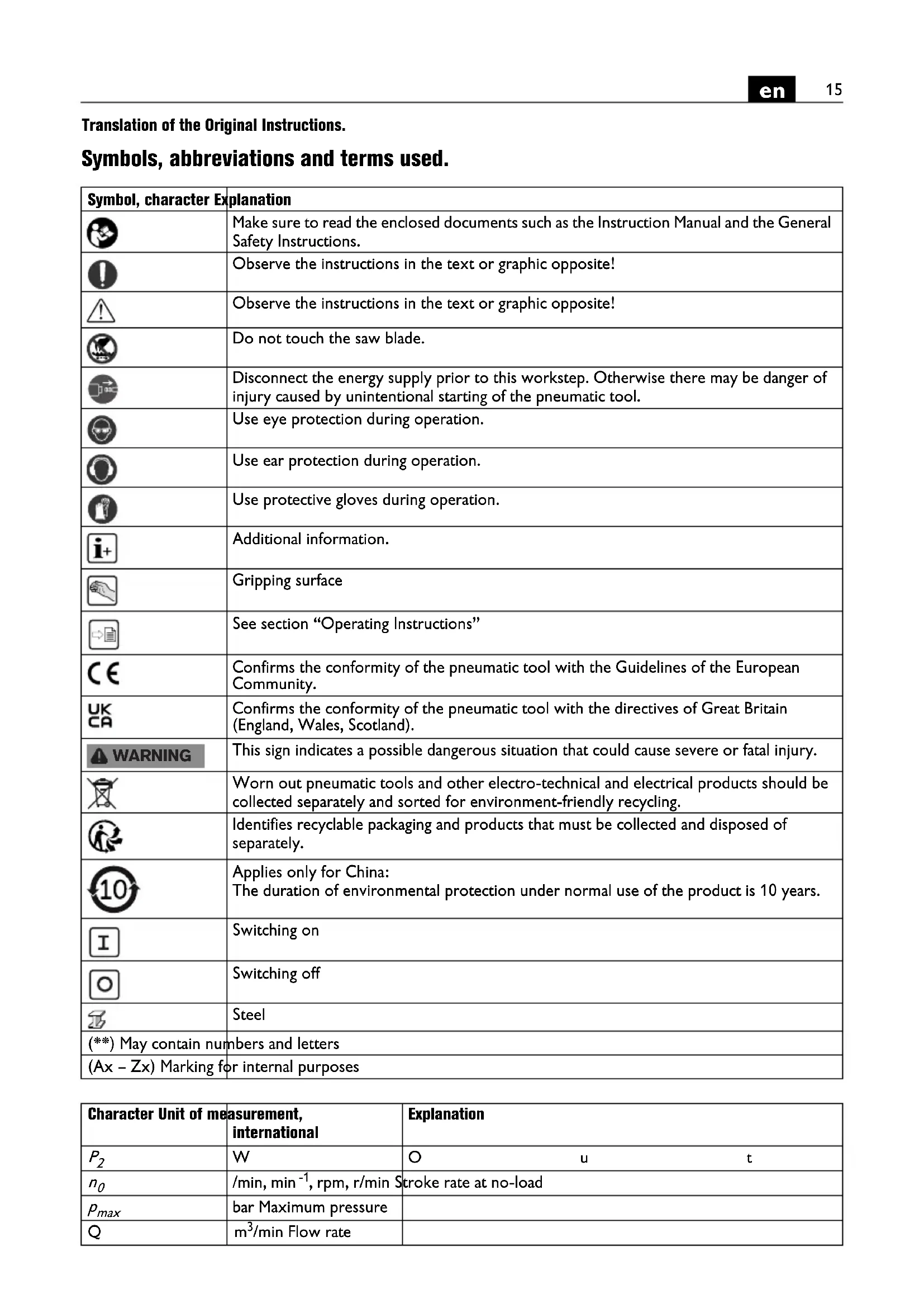 Translation of the Original Instructions. Symbols, abbreviations and terms used. Symbol, character Explanation Make sure to read the enclosed documents such as the Instruction Manual and the General Safety Instructions. Observe the instructions in the text or graphic opposite! Observe the instructions in the text or graphic opposite! Do not touch the saw blade. Disconnect the energy supply prior to this workstep. Otherwise there may be danger of injury caused by unintentional starting of the pneumatic tool. Use eye protection during operation. Use ear protection during operation. Use protective gloves during operation. Additional information. Gripping surface See section “Operating Instructions” Confirms the conformity of the pneumatic tool with the Guidelines of the European Community. Confirms the conformity of the pneumatic tool with the directives of Great Britain (England, Wales, Scotland). This sign indicates a possible dangerous situation that could cause severe or fatal injury. Worn out pneumatic tools and other electro-technical and electrical products should be collected separately and sorted for environment-friendly recycling. Identifies recyclable packaging and products that must be collected and disposed of separately. Applies only for China: The duration of environmental protection under normal use of the product is 10 years. Switching on Switching off Steel (**) May contain numbers and letters (Ax – Zx) Marking for internal purposes WARNING Character Unit of measurement, international Explanation