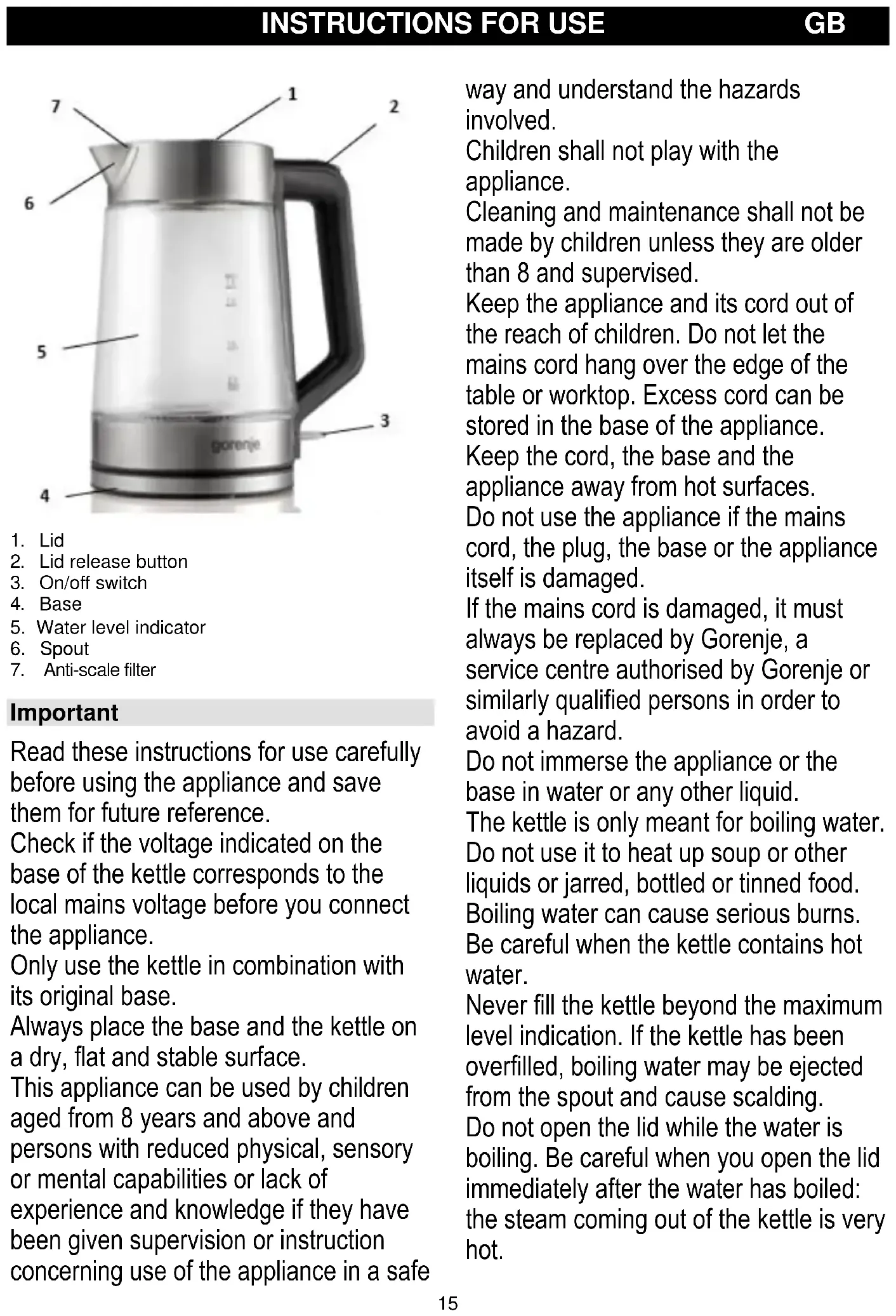 Important Read these instructions for use carefully before using the appliance and save them for future reference. Check if the voltage indicated on the base of the kettle corresponds to the local mains voltage before you connect the appliance. Only use the kettle in combination with its original base. Always place the base and the kettle on a dry, flat and stable surface. This appliance can be used by children aged from 8 years and above and persons with reduced physical, sensory or mental capabilities or lack of experience and knowledge if they have been given supervision or instruction concerning use of the appliance in a safe way and understand the hazards involved. Children shall not play with the appliance. Cleaning and maintenance shall not be made by children unless they are older than 8 and supervised. Keep the appliance and its cord out of the reach of children. Do not let the mains cord hang over the edge of the table or worktop. Excess cord can be stored in the base of the appliance. Keep the cord, the base and the appliance away from hot surfaces. Do not use the appliance if the mains cord, the plug, the base or the appliance itself is damaged. If the mains cord is damaged, it must always be replaced by Gorenje, a service centre authorised by Gorenje or similarly qualified persons in order to avoid a hazard. Do not immerse the appliance or the base in water or any other liquid. The kettle is only meant for boiling water. Do not use it to heat up soup or other liquids or jarred, bottled or tinned food. Boiling water can cause serious burns. Be careful when the kettle contains hot water. Never fill the kettle beyond the maximum level indication. If the kettle has been overfilled, boiling water may be ejected from the spout and cause scalding. Do not open the lid while the water is boiling. Be careful when you open the lid immediately after the water has boiled: the steam coming out of the kettle is very hot.16 Avoid touching the body of the kettle, as it gets very hot during use. Always lift the kettle by its handle. Always make sure the water in the kettle at least covers the bottom of the kettle to prevent the kettle from boiling dry. Some condensation may appear on the base of the kettle. This is perfectly normal and does not mean that the kettle has any defects. Depending on the hardness of the water in your area, small spots may appear on the heating element of your kettle when you use it. This phenomenon is the result of scale build-up on the heating element and on the inside of the kettle over time. The harder the water, the faster scale will build up. Scale can occur in different colours. Although scale is harmless, too much scale can influence the performance of your kettle. Descale your kettle regularly by following the instructions given in the chapter ‘Descaling’. Electromagnetic fields (EMF) This Gorenje appliance complies with all standards regarding electromagnetic fields (EMF). If handled properly and according to the instructions in this user manual, the appliance is safe to use based on scientific evidence available today. This appliance is marked according to the European directive 2012/19/EU on Waste Electrical and Electronic Equipment (WEEE). This guideline is the frame of a European- wide validity of return and recycling on Waste Electrical and Electronic Equipment. Boil-dry protection This kettle is equipped with boil-dry protection. This device will automatically switch the kettle off if it is accidentally switched on when there is no water or not enough water in it. The on/off switch will stay in ‘on’ position, but the power-on light ring will go out. Set the on/off switch to ‘off ’ and let the kettle cool down for 10 minutes. Then lift the kettle from its base to reset the boil-dry protection. The kettle is now ready for use again. Before first use
