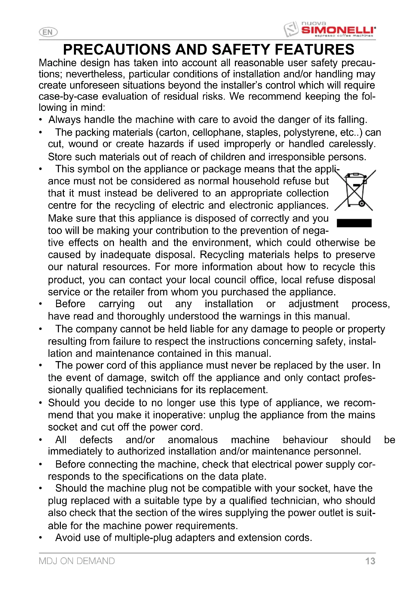 IMPORTANT INFORMATION Thismanualisdesignedforusebytheuserofthemachineand/orbythose performing maintenance on the machine and must be considered an inte- gral part of the machine itself. Thismanualprovidesinformationconcerningcorrectuseandappropriate maintenance of the machine, as well as useful indications for ensuring user safety. Thismanualmustbepreservedfortheentireworkinglifeofthemachine and must be transferred, together with the machine, to future users or owners.The information containedinthismanual must notbeconstrued as substituting the safety prescriptions and the technical data regarding installation and operation carried on the machine itself and on the packing materials. Thismanualreflectsthecurrentstateofmachinetechnologyandshallnot be considered obsolete solely because updated at a later date on the basis ofacquiredexperience. Themanufacturerreservestherighttomakemodificationstothismanual withnoobligationtoupdatepreviousversionsexceptinexceptionalcases. Improperuseofthemachineoruseinmannersotherthanthosedescribed in this manual shall invalidate the guarantee conditions and shall release the manufacturer from all responsibility, the machine must be used only by adult, responsible persons. This manual must be preserved with care: the manufacturer declines all responsibility for damages to persons or things or to the machine itself deriving from improper use or use in manners other than those described herein or in the case the maintenance and safety precautions described herein are not respected.