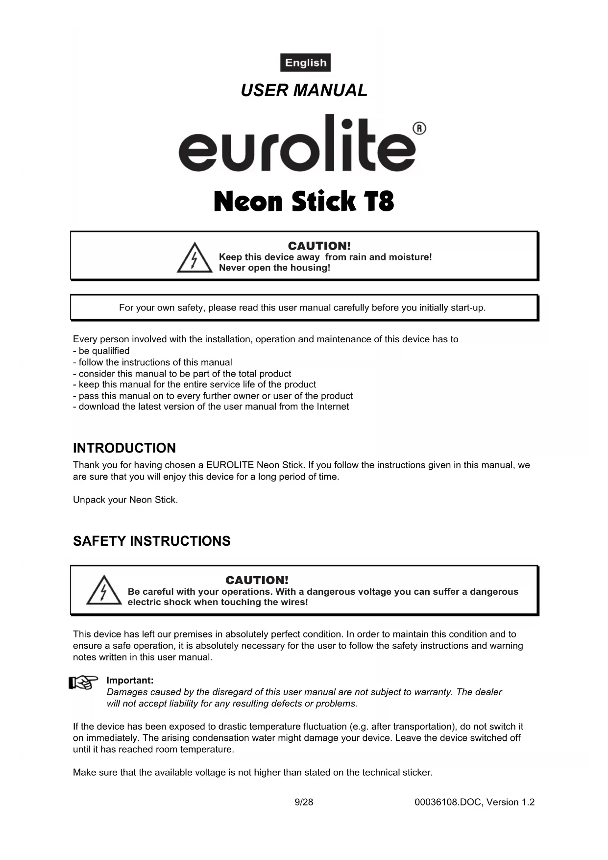For your own safety, please read this user manual carefully before you initially start-up. Every person involved with the installation, operation and maintenance of this device has to - be qualilfied - follow the instructions of this manual - consider this manual to be part of the total product - keep this manual for the entire service life of the product - pass this manual on to every further owner or user of the product - download the latest version of the user manual from the Internet INTRODUCTION Thank you for having chosen a EUROLITE Neon Stick. If you follow the instructions given in this manual, we are sure that you will enjoy this device for a long period of time. Unpack your Neon Stick. SAFETY INSTRUCTIONS CAUTION! Becarefulwithyouroperations.Withadangerousvoltageyoucansufferadangerouselectricshockwhentouchingthewires!