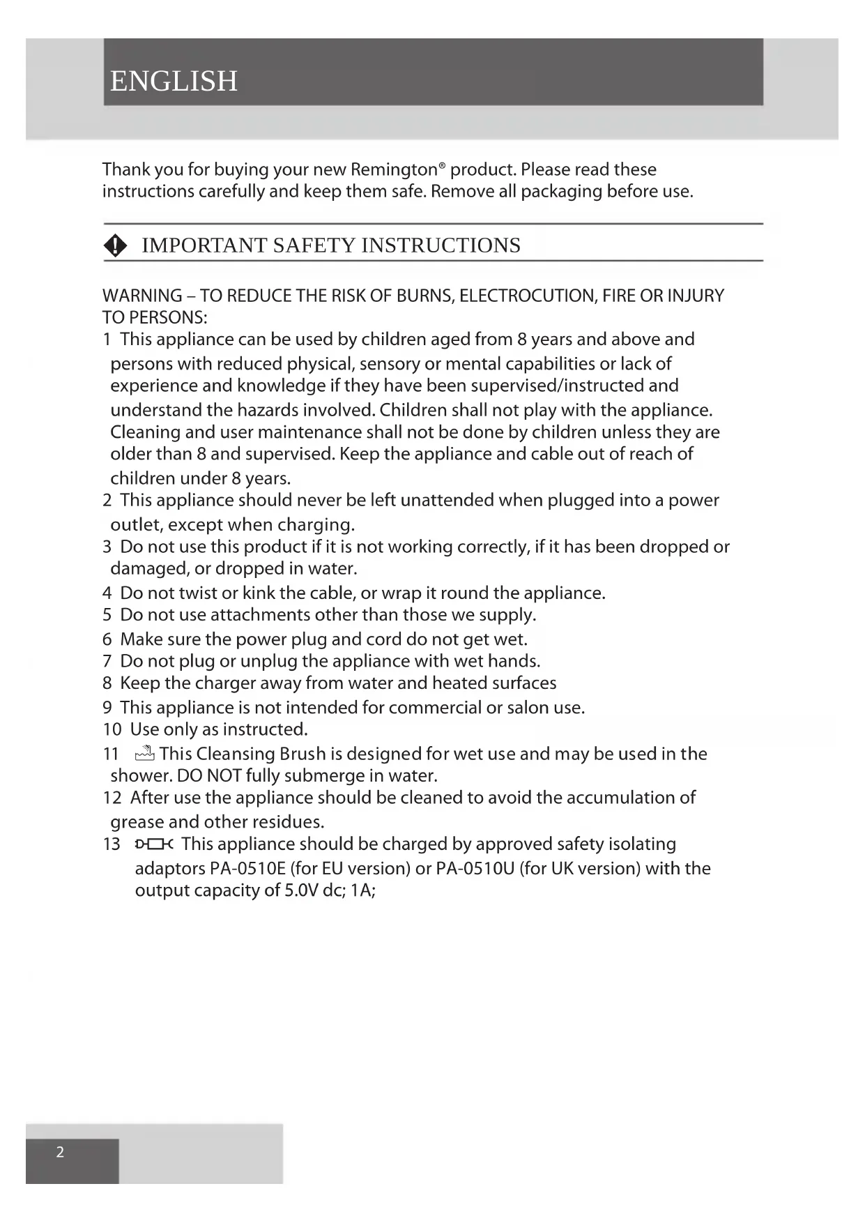WARNING – TO REDUCE THE RISK OF BURNS, ELECTROCUTION, FIRE OR INJURY TO PERSONS: 1 This appliance can be used by children aged from 8 years and above and persons with reduced physical, sensory or mental capabilities or lack of experience and knowledge if they have been supervised/instructed and understand the hazards involved. Children shall not play with the appliance. Cleaning and user maintenance shall not be done by children unless they are older than 8 and supervised. Keep the appliance and cable out of reach of children under 8 years. 2 This appliance should never be left unattended when plugged into a power outlet, except when charging. 3 Do not use this product if it is not working correctly, if it has been dropped or damaged, or dropped in water. 4 Do not twist or kink the cable, or wrap it round the appliance. 5 Do not use attachments other than those we supply. 6 Make sure the power plug and cord do not get wet. 7 Do not plug or unplug the appliance with wet hands. 8 Keep the charger away from water and heated surfaces 9 This appliance is not intended for commercial or salon use. 10 Use only as instructed. 11 E This Cleansing Brush is designed for wet use and may be used in the shower. DO NOT fully submerge in water. 12 After use the appliance should be cleaned to avoid the accumulation of grease and other residues.