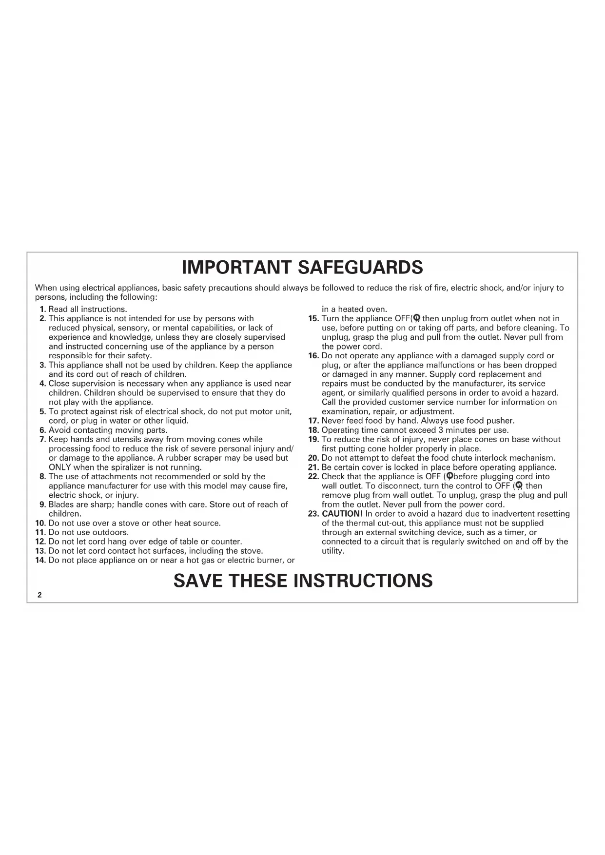 processing food to reduce the risk of severe personal injury and/ or damage to the appliance. A rubber scraper may be used but ONLY when the spiralizer is not running.