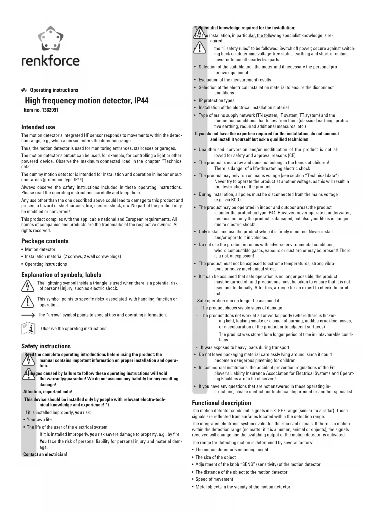 Download the instructions for your Motion detector in PDF format for free! Find your manual 1362991 - Renkforce and take your electronic device back in hand. On this page are published all the documents necessary for the use of your device. 1362991 by Renkforce.