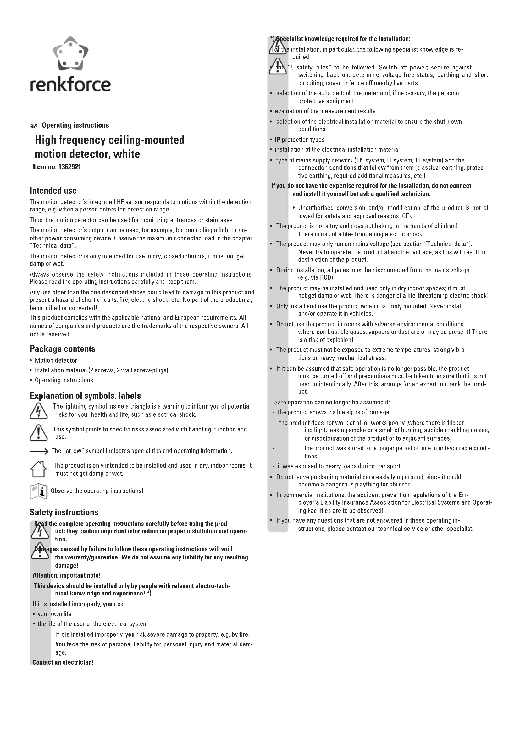 Operating instructions High frequency ceiling-mounted motion detector, white Item no. 1362921 Intended use The motion detector’s integrated HF sensor responds to motions within the detection range, e.g. when a person enters the detection range. Thus, the motion detector can be used for monitoring entrances or staircases. The motion detector’s output can be used, for example, for controlling a light or an- other power consuming device. Observe the maximum connected load in the chapter “Technical data”. The motion detector is only intended for use in dry, closed interiors, it must not get damp or wet. Always observe the safety instructions included in these operating instructions. Please read the operating instructions carefully and keep them. Any use other than the one described above could lead to damage to this product and present a hazard of short circuits, fire, electric shock, etc. No part of the product may be modified or converted! This product complies with the applicable national and European requirements. All names of companies and products are the trademarks of the respective owners. All rights reserved. Package contents