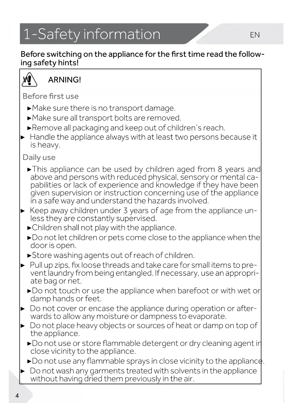 ARNING! Before rst use ▶ Make sure there is no transport damage. ▶ Make sure all transport bolts are removed. ▶ Remove all packaging and keep out of children´s reach. ▶ Handle the appliance always with at least two persons because it is heavy. Daily use ▶ This appliance can be used by children aged from 8 years and above and persons with reduced physical, sensory or mental ca- pabilities or lack of experience and knowledge if they have been given supervision or instruction concerning use of the appliance in a safe way and understand the hazards involved. ▶ Keep away children under 3 years of age from the appliance un- less they are constantly supervised. ▶ Children shall not play with the appliance. ▶ Do not let children or pets come close to the appliance when the door is open. ▶ Store washing agents out of reach of children. ▶ Pull up zips, x loose threads and take care for small items to pre- vent laundry from being entangled. If necessary, use an appropri- ate bag or net. ▶ Do not touch or use the appliance when barefoot or with wet or damp hands or feet. ▶ Do not cover or encase the appliance during operation or after- wards to allow any moisture or dampness to evaporate. ▶ Do not place heavy objects or sources of heat or damp on top of the appliance. ▶ Do not use or store flammable detergent or dry cleaning agent in close vicinity to the appliance. ▶ Do not use any flammable sprays in close vicinity to the appliance. ▶ Do not wash any garments treated with solvents in the appliance without having dried them previously in the air.EN 1-Safety information
