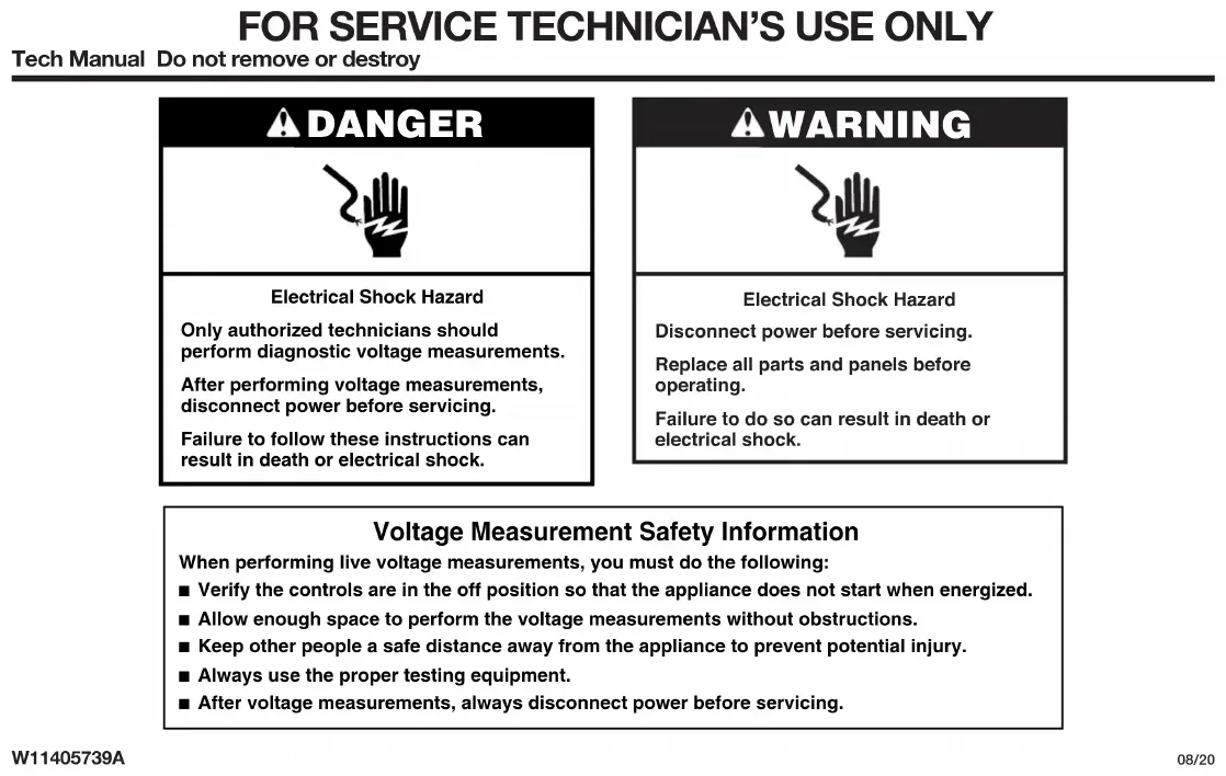 Tech Manual Do not remove or destroy W11405739A 08/20 WARNING Electrical Shock Hazard Disconnect power before servicing. Replace all parts and panels before operating. Failure to do so can result in death or electrical shock. DANGER Electrical Shock Hazard Only authorized technicians should perform diagnostic voltage measurements. After performing voltage measurements, disconnect power before servicing. Failure to follow these instructions can result in death or electrical shock. Voltage Measurement Safety Information When performing live voltage measurements, you must do the following: ■ Verify the controls are in the off position so that the appliance does not start when energized. ■ Allow enough space to perform the voltage measurements without obstructions.■ Keep other people a safe distance away from the appliance to prevent potential injury.■ Always use the proper testing equipment.■ After voltage measurements, always disconnect power before servicing.FOR SERVICE TECHNICIAN’S USE ONLY