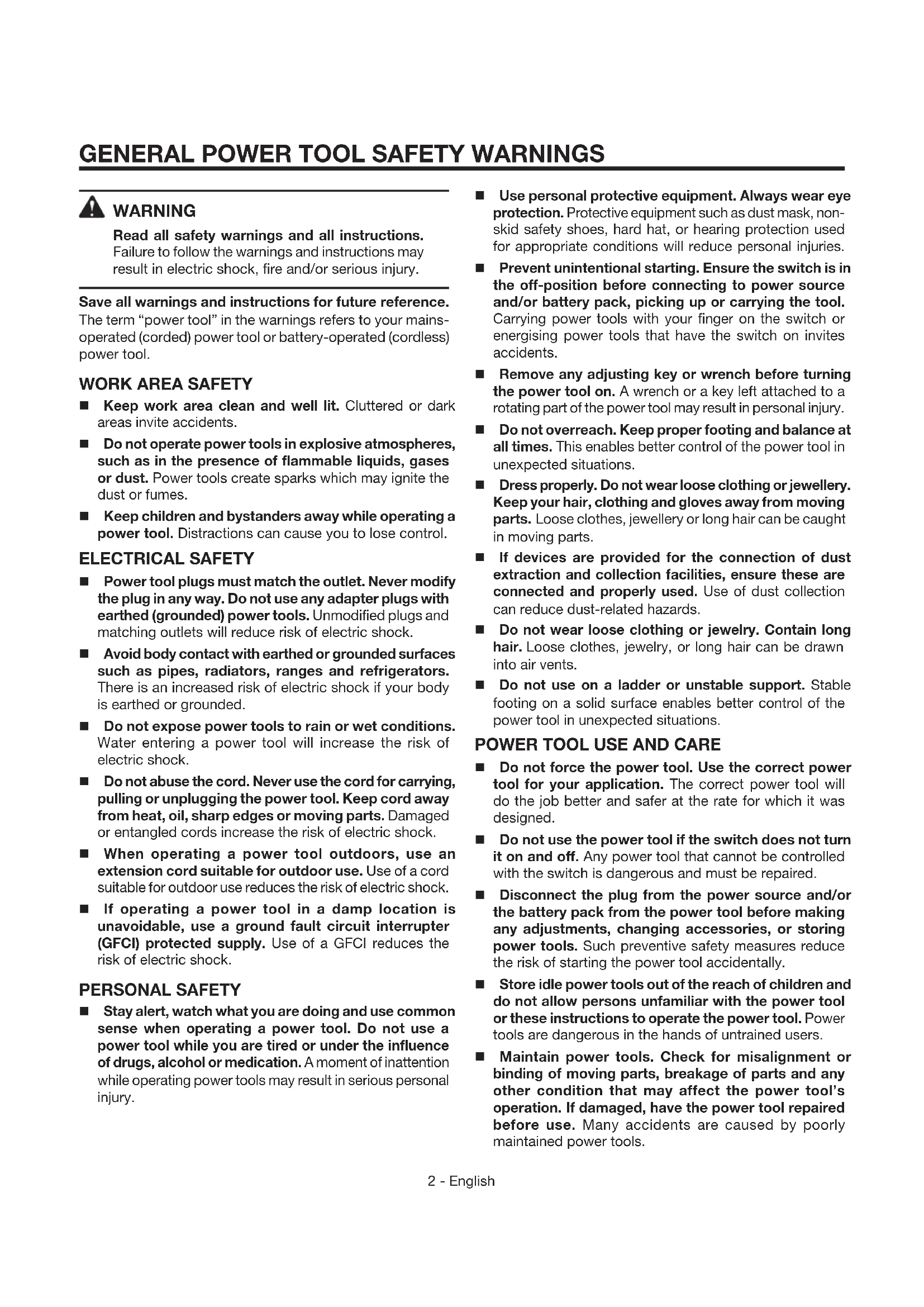 Keep work area clean and well lit. Cluttered or dark areas invite accidents. Do not operate power tools in explosive atmospheres, such as in the presence of flammable liquids, gases or dust. Power tools create sparks which may ignite the dust or fumes. Keep children and bystanders away while operating a power tool. Distractions can cause you to lose control. ELECTRICAL SAFETY Power tool plugs must match the outlet. Never modify the plug in any way. Do not use any adapter plugs with earthed (grounded) power tools. Unmodified plugs and matching outlets will reduce risk of electric shock. Avoid body contact with earthed or grounded surfaces such as pipes, radiators, ranges and refrigerators. There is an increased risk of electric shock if your body is earthed or grounded. Do not expose power tools to rain or wet conditions. Water entering a power tool will increase the risk of electric shock. Do not abuse the cord. Never use the cord for carrying, pulling or unplugging the power tool. Keep cord away from heat, oil, sharp edges or moving parts. Damaged or entangled cords increase the risk of electric shock. When operating a power tool outdoors, use an extension cord suitable for outdoor use. Use of a cord suitable for outdoor use reduces the risk of electric shock. If operating a power tool in a damp location is unavoidable, use a ground fault circuit interrupter (GFCI) protected supply. Use of a GFCI reduces the risk of electric shock. PERSONAL SAFETY Stay alert, watch what you are doing and use common sense when operating a power tool. Do not use a power tool while you are tired or under the influence of drugs, alcohol or medication. A moment of inattention while operating power tools may result in serious personal injury. Use personal protective equipment. Always wear eye protection. Protective equipment such as dust mask, non- skid safety shoes, hard hat, or hearing protection used for appropriate conditions will reduce personal injuries. Prevent unintentional starting. Ensure the switch is in the off-position before connecting to power source and/or battery pack, picking up or carrying the tool. Carrying power tools with your finger on the switch or energising power tools that have the switch on invites accidents. Remove any adjusting key or wrench before turning the power tool on. A wrench or a key left attached to a rotating part of the power tool may result in personal injury. Do not overreach. Keep proper footing and balance at all times. This enables better control of the power tool in unexpected situations. Dress properly. Do not wear loose clothing or jewellery. Keep your hair, clothing and gloves away from moving parts. Loose clothes, jewellery or long hair can be caught in moving parts. If devices are provided for the connection of dust extraction and collection facilities, ensure these are connected and properly used. Use of dust collection can reduce dust-related hazards. Do not wear loose clothing or jewelry. Contain long hair. Loose clothes, jewelry, or long hair can be drawn into air vents. Do not use on a ladder or unstable support. Stable footing on a solid surface enables better control of the power tool in unexpected situations.
