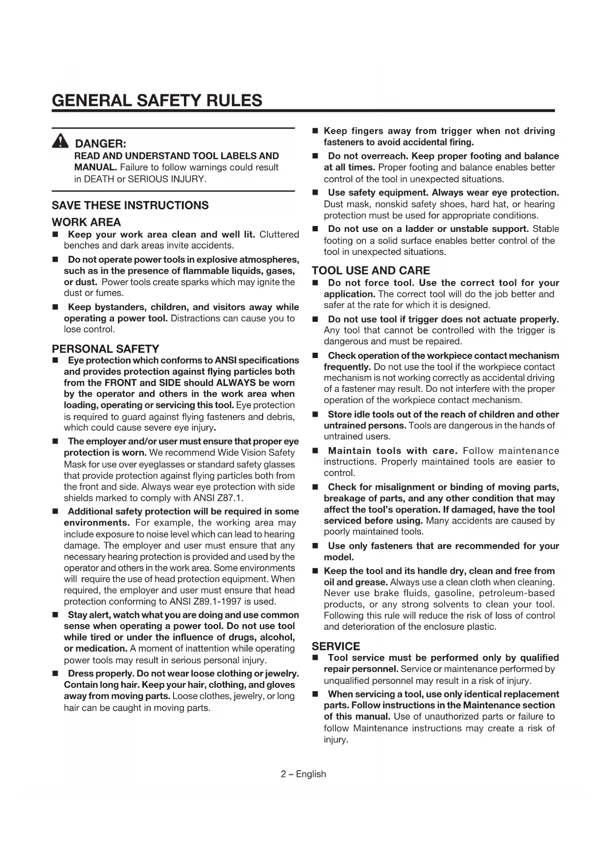 Do not force tool. Use the correct tool for your application. The correct tool will do the job better and safer at the rate for which it is designed. Do not use tool if trigger does not actuate properly. Any tool that cannot be controlled with the trigger is dangerous and must be repaired. Check operation of the workpiece contact mechanism frequently. Do not use the tool if the workpiece contact mechanism is not working correctly as accidental driving of a fastener may result. Do not interfere with the proper operation of the workpiece contact mechanism. Store idle tools out of the reach of children and other untrained persons. Tools are dangerous in the hands of untrained users. Maintain tools with care. Follow maintenance instructions. Properly maintained tools are easier to control. Check for misalignment or binding of moving parts, breakage of parts, and any other condition that may affect the tool’s operation. If damaged, have the tool serviced before using. Many accidents are caused by poorly maintained tools. Use only fasteners that are recommended for your model. Keep the tool and its handle dry, clean and free from oil and grease. Always use a clean cloth when cleaning. Never use brake fluids, gasoline, petroleum-based products, or any strong solvents to clean your tool. Following this rule will reduce the risk of loss of control and deterioration of the enclosure plastic. SERVICE Tool service must be performed only by qualified repair personnel. Service or maintenance performed by unqualified personnel may result in a risk of injury. When servicing a tool, use only identical replacement parts. Follow instructions in the Maintenance section of this manual. Use of unauthorized parts or failure to follow Maintenance instructions may create a risk of injury.3 – English