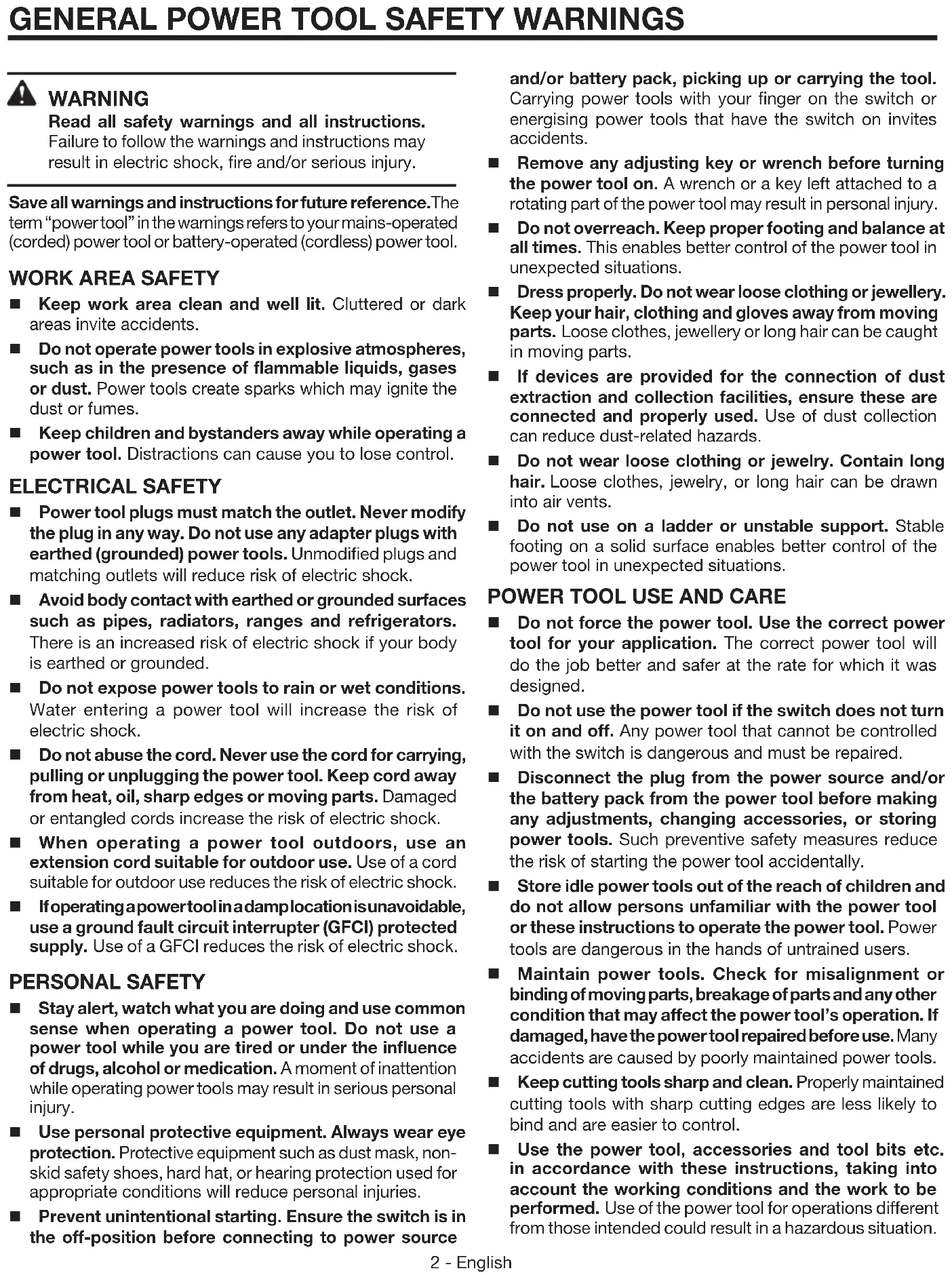 WARNING Read all safety warnings and all instructions. Failure to follow the warnings and instructions may result in electric shock, fire and/or serious injury. Save all warnings and instructions for future reference.The term “power tool” in the warnings refers to your mains-operated (corded) power tool or battery-operated (cordless) power tool.