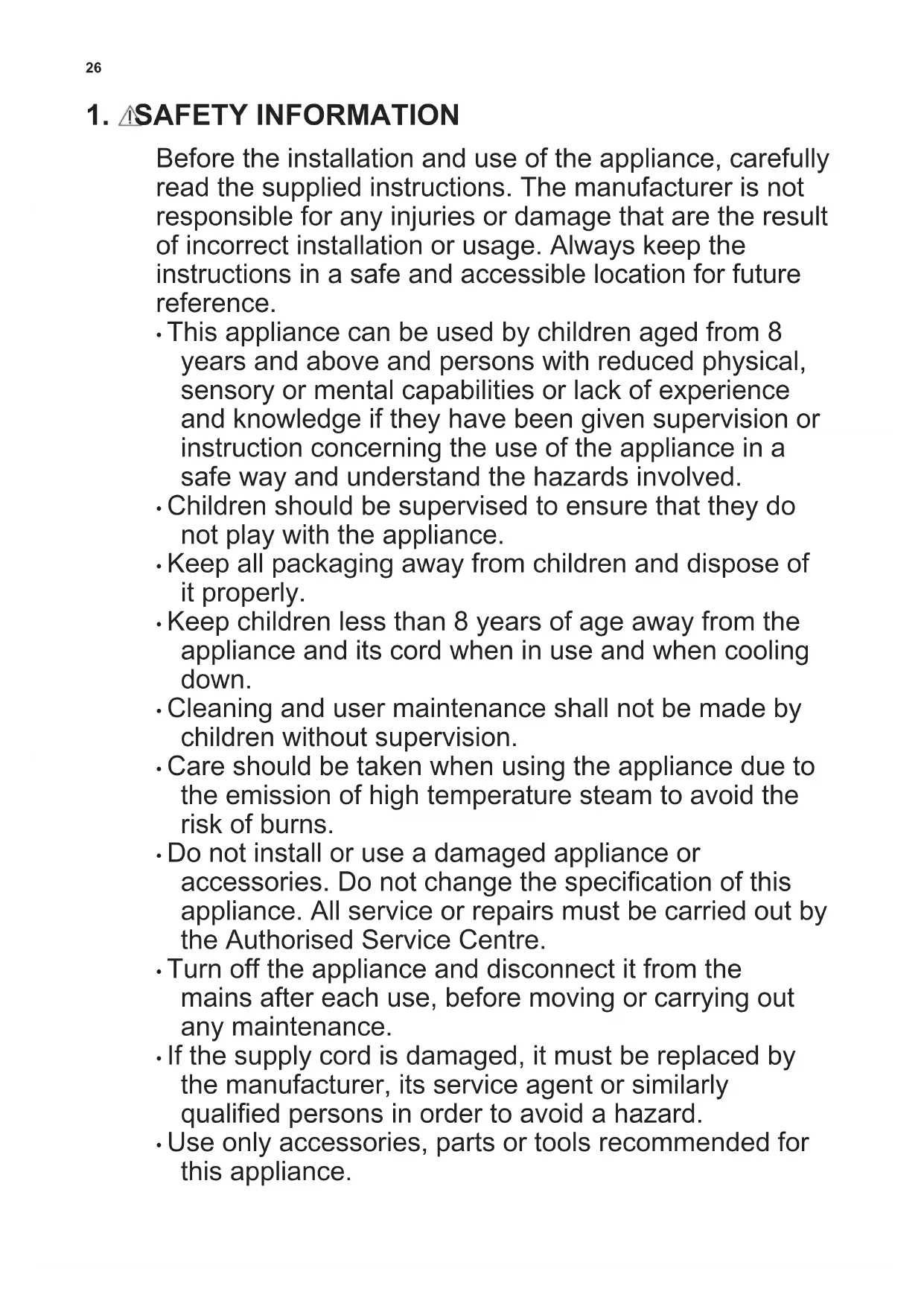 - This appliance can be used by children aged from 8 years and above and persons with reduced physical, sensory or mental capabilities or lack of experience and knowledge if they have been given supervision or instruction concerning the use of the appliance in a safe way and understand the hazards involved.