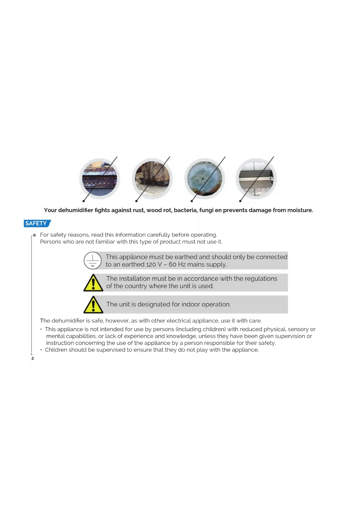 - Children should be supervised to ensure that they do not play with the appliance. The installation must be in accordance with the regulations of the country where the unit is used. The unit is designated for indoor operation. This appliance must be earthed and should only be connected to an earthed 120 V – 60 Hz mains supply. Your dehumidier ghts against rust, wood rot, bacteria, fungi en prevents damage from moisture.