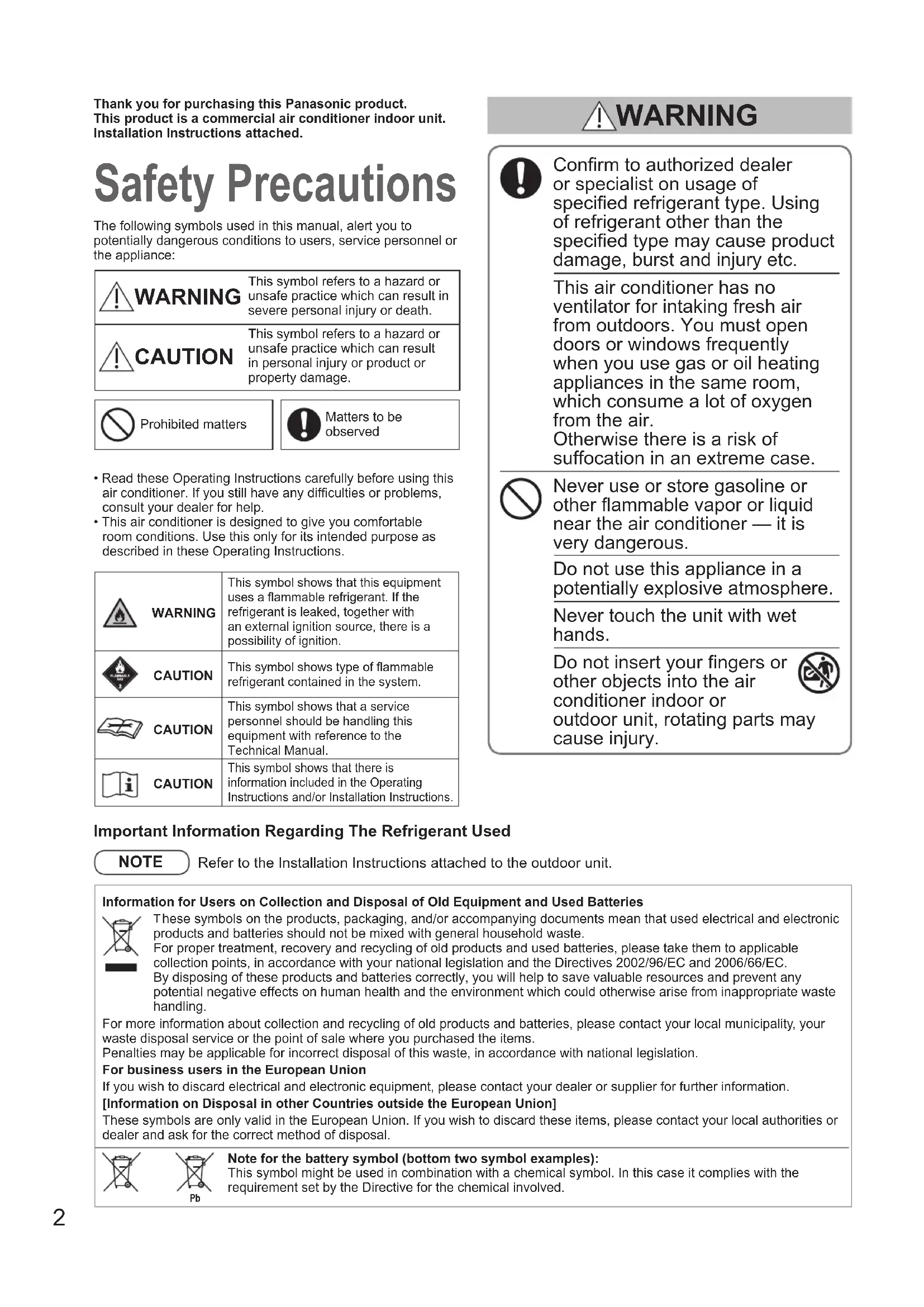 B.INDONESIA 00_330260_all.indb 1 2020/11/23 13:35:012 Thank you for purchasing this Panasonic product.This product is a commercial air conditioner indoor unit.Installation Instructions attached. Safety Precautions The following symbols used in this manual, alert you to potentially dangerous conditions to users, service personnel or the appliance: WARNING This symbol refers to a hazard or unsafe practice which can result in severe personal injury or death. CAUTION This symbol refers to a hazard or unsafe practice which can result in personal injury or product or property damage.Prohibited mattersMatters to be observed• Read these Operating Instructions carefully before using this air conditioner. If you still have any difculties or problems, consult your dealer for help.• This air conditioner is designed to give you comfortable room conditions. Use this only for its intended purpose as described in these Operating Instructions. Conrm to authorized dealer or specialist on usage of specied refrigerant type. Using of refrigerant other than the specied type may cause product damage, burst and injury etc. This air conditioner has no ventilator for intaking fresh air from outdoors. You must open doors or windows frequently when you use gas or oil heating appliances in the same room, which consume a lot of oxygen from the air. Otherwise there is a risk of suffocation in an extreme case. Never use or store gasoline or other ammable vapor or liquid near the air conditioner — it is very dangerous. Do not use this appliance in a potentially explosive atmosphere. Never touch the unit with wet hands. Do not insert your ngers or other objects into the air conditioner indoor or outdoor unit, rotating parts may cause injury. WARNING WARNINGThis symbol shows that this equipment uses a flammable refrigerant. If the refrigerant is leaked, together with an external ignition source, there is a possibility of ignition.CAUTIONThis symbol shows type of flammable refrigerant contained in the system.CAUTIONThis symbol shows that a service personnel should be handling this equipment with reference to the Technical Manual.CAUTIONThis symbol shows that there is information included in the Operating Instructions and/or Installation Instructions.Important Information Regarding The Refrigerant Used NOTE Refer to the Installation Instructions attached to the outdoor unit.Information for Users on Collection and Disposal of Old Equipment and Used Batteries hese symbols on the products, packaging, and/or accompanying documents mean that used electrical and electronic products and batteries should not be mixed with general household waste.For proper treatment, recovery and recycling of old products and used batteries, please take them to applicable collection points, in accordance with your national legislation and the Directives 2002/96/EC and 2006/66/EC.By disposing of these products and batteries correctly, you will help to save valuable resources and prevent any potential negative effects on human health and the environment which could otherwise arise from inappropriate waste handling. For more information about collection and recycling of old products and batteries, please contact your local municipality, your waste disposal service or the point of sale where you purchased the items.Penalties may be applicable for incorrect disposal of this waste, in accordance with national legislation.For business users in the European Union If you wish to discard electrical and electronic equipment, please contact your dealer or supplier for further information. [Information on Disposal in other Countries outside the European Union] These symbols are only valid in the European Union. If you wish to discard these items, please contact your local authorities or dealer and ask for the correct method of disposal. Note for the battery symbol (bottom two symbol examples):This symbol might be used in combination with a chemical symbol. In this case it complies with the requirement set by the Directive for the chemical involved. 00_330260_all.indb 2 2020/11/23 13:35:013 ENGLISH If the refrigerant comes in contact with a ame, it produces a toxic gas. For safety, be sure to turn the air conditioner off and also to disconnect the power before cleaning or servicing. Pull off the power plug from a receptacle, or switch off the breaker, or switch off the power disconnecting mean to isolate the air conditioner from the main power supply in case of emergency. Dispose of according to national and/or local legislation. This product must not be modied or disassembled under any circumstances. Modied or disassembled unit may cause re, electric shock or injury. Do not clean inside the indoor and outdoor units by users. Engage authorized dealer or specialist for cleaning. In case of malfunction of this appliance, do not repair by yourself. Contact the sales dealer or service dealer for a repair and disposal. Provide a power outlet to be used exclusively for each unit, and a power supply disconnect, Earth Leakage Circuit Breaker (ELCB) or Residual Current Device (RCD) for overcurrent protection should be provided in the exclusive line. Provide a power outlet exclusively for each unit, and full disconnection means having a contact separation in all poles must be incorporated in the xed wiring in accordance with the wiring rules. To prevent possible hazards from insulation failure, the unit must be grounded. WARNING Do not use modied cord, joint cord, extension cord or unspecied cord to prevent overheating and re. The appliance shall be stored in a room without continuously operating ignition sources (for example: open ames, an operating gas appliance or an operating electric heater). Be aware that refrigerants may not contain an odour. An unventilated area where the appliance using ammable refrigerants is installed shall be so constructed that should any refrigerant leak, it will not stagnate so as to create a re or explosion hazard. The appliance shal