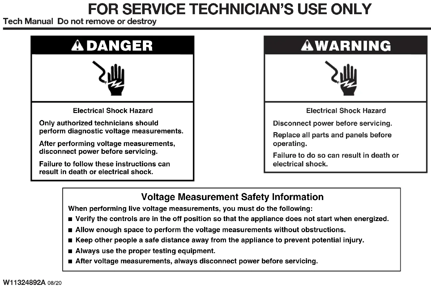 Tech Manual Do not remove or destroy W11324892A 08/20 WARNING Electrical Shock Hazard Disconnect power before servicing. Replace all parts and panels before operating. Failure to do so can result in death or electrical shock. DANGER Electrical Shock Hazard Only authorized technicians should perform diagnostic voltage measurements. After performing voltage measurements, disconnect power before servicing. Failure to follow these instructions can result in death or electrical shock. Voltage Measurement Safety Information When performing live voltage measurements, you must do the following: ■ Verify the controls are in the off position so that the appliance does not start when energized. ■ Allow enough space to perform the voltage measurements without obstructions.■ Keep other people a safe distance away from the appliance to prevent potential injury.■ Always use the proper testing equipment.■ After voltage measurements, always disconnect power before servicing.FOR SERVICE TECHNICIAN’S USE ONLY