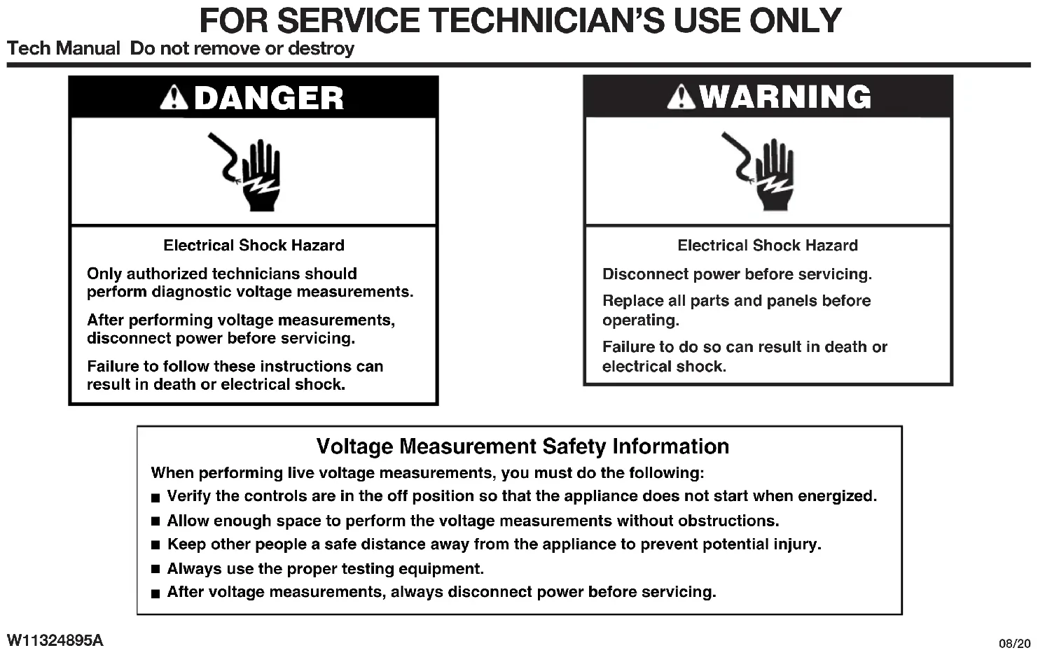 Tech Manual Do not remove or destroy W11324895A 08/20 WARNING Electrical Shock Hazard Disconnect power before servicing. Replace all parts and panels before operating. Failure to do so can result in death or electrical shock. DANGER Electrical Shock Hazard Only authorized technicians should perform diagnostic voltage measurements. After performing voltage measurements, disconnect power before servicing. Failure to follow these instructions can result in death or electrical shock. Voltage Measurement Safety Information When performing live voltage measurements, you must do the following: