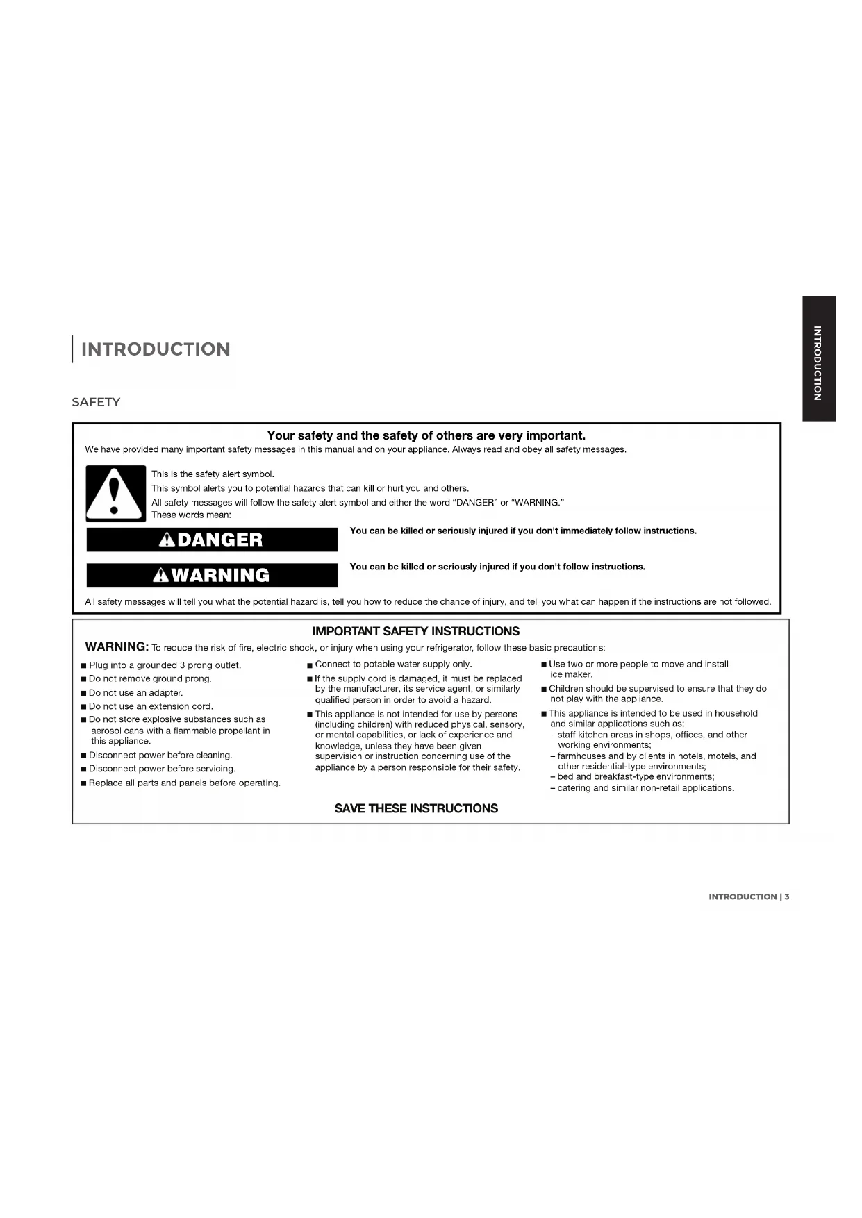 MACHINE À GLAÇONS ENCASTRÉE SOUS LE COMPTOIRINTRODUCTION | 3 INTRODUCTION INTRODUCTION All safety messages will tell you what the potential hazard is, tell you how to reduce the chance of injury, and tell you what can happen if the instructions are not followed. Your safety and the safety of others are very important. We have provided many important safety messages in this manual and on your appliance. Always read and obey all safety messages. This is the safety alert symbol.This symbol alerts you to potential hazards that can kill or hurt you and others.All safety messages will follow the safety alert symbol and either the word “DANGER” or “WARNING.”These words mean: DANGER WARNING You can be killed or seriously injured if you don't immediately follow instructions.You can be killed or seriously injured if you don't follow instructions.