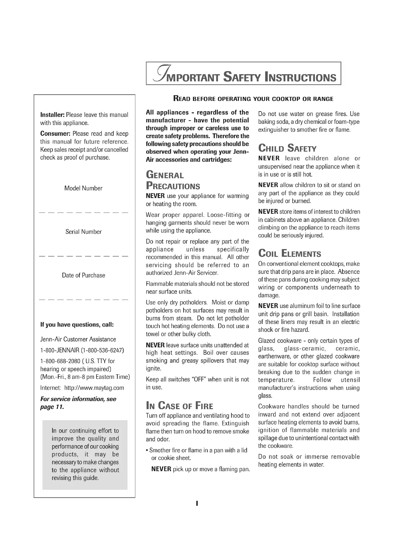 Turn off appliance and ventilating hood toavoid spreading the flame. Extinguishflame then turn on hood to remove smokeand odor.• Smother fire or flame in a pan with a lidor cookie sheet.NEVER pick up or move a flaming pan.Installer: Please leave this manualwith this appliance.Consumer: Please read and keepthis manual for future reference.Keep sales receipt and/or cancelledcheck as proof of purchase.Model Number__ __ __ __ __ __ __ __ __ __Serial Number__ __ __ __ __ __ __ __ __ __Date of Purchase__ __ __ __ __ __ __ __ __ __If you have questions, call:Jenn-Air Customer Assistance1-800-JENNAIR (1-800-536-6247)1-800-688-2080 ( U.S. TTY forhearing or speech impaired)(Mon.-Fri., 8 am-8 pm Eastern Time)Internet: http://www.maytag.comFor service information, seepage 11.In our continuing effort toimprove the quality andperformance of our cookingproducts, it may benecessary to make changesto the appliance withoutrevising this guide.All appliances - regardless of themanufacturer - have the potentialthrough improper or careless use tocreate safety problems. Therefore thefollowing safety precautions should beobserved when operating your Jenn-Air accessories and cartridges: READ BEFORE OPERATING YOUR COOKTOP OR RANGE Do not use water on grease fires. Usebaking soda, a dry chemical or foam-typeextinguisher to smother fire or flame. CHILD SAFETY NEVER leave children alone orunsupervised near the appliance when itis in use or is still hot.NEVER allow children to sit or stand onany part of the appliance as they couldbe injured or burned.NEVER store items of interest to childrenin cabinets above an appliance. Childrenclimbing on the appliance to reach itemscould be seriously injured. COIL ELEMENTS On conventional element cooktops, makesure that drip pans are in place. Absenceof these pans during cooking may subjectwiring or components underneath todamage.NEVER use aluminum foil to line surfaceunit drip pans or grill basin. Installationof these liners may result in an electricshock or fire hazard.Glazed cookware - only certain types ofglass, glass-ceramic, ceramic,earthenware, or other glazed cookwareare suitable for cooktop surface withoutbreaking due to the sudden change intemperature. Follow utensilmanufacturer’s instructions when usingglass.Cookware handles should be turnedinward and not extend over adjacentsurface heating elements to avoid burns,ignition of flammable materials andspillage due to unintentional contact withthe cookware.Do not soak or immerse removableheating elements in water.