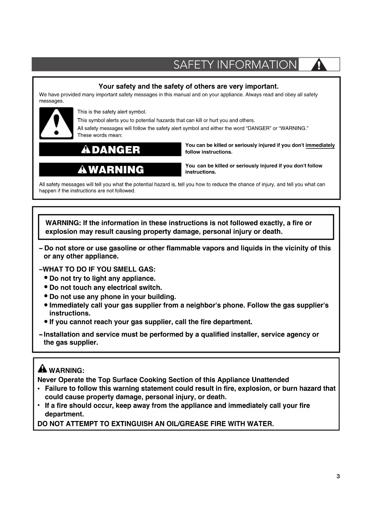 Never Operate the Top Surface Cooking Section of this Appliance Unattended Failure to follow this warning statement could result in fire, explosion, or burn hazard that could cause property damage, personal injury, or death. If a fire should occur, keep away from the appliance and immediately call your fire department. DO NOT ATTEMPT TO EXTINGUISH AN OIL/GREASE FIRE WITH WATER.