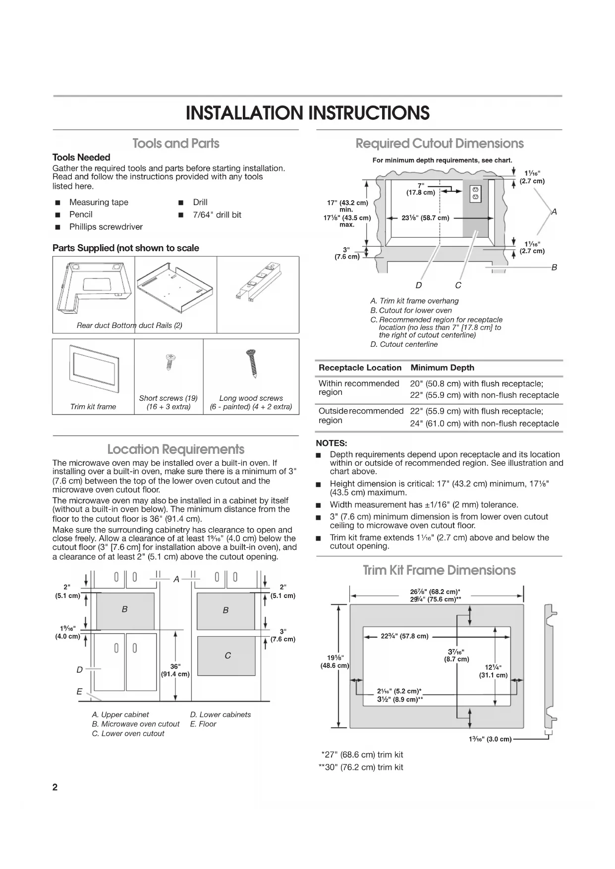 Required Cutout Dimensions NOTES: Depth requirements depend upon receptacle and its location within or outside of recommended region. See illustration and chart above. Height dimension is critical: 17" (43.2 cm) minimum, 17¹⁄₈" (43.5 cm) maximum. Width measurement has ±1/16" (2 mm) tolerance. 3" (7.6 cm) minimum dimension is from lower oven cutout ceiling to microwave oven cutout floor. Trim kit frame extends 1¹⁄₁₆" (2.7 cm) above and below the cutout opening. Trim Kit Frame Dimensions *27" (68.6 cm) trim kit **30" (76.2 cm) trim kit Measuring tape Pencil Phillips screwdriver Drill 7/64" drill bit Rear duct Bottom duct Rails (2)Short screws (19)(16 + 3 extra)Long wood screws (6 - painted) (4 + 2 extra)Trim kit frameA. Upper cabinetB. Microwave oven cutoutC. Lower oven cutoutD. Lower cabinetsE. Floor3"(7.6 cm)