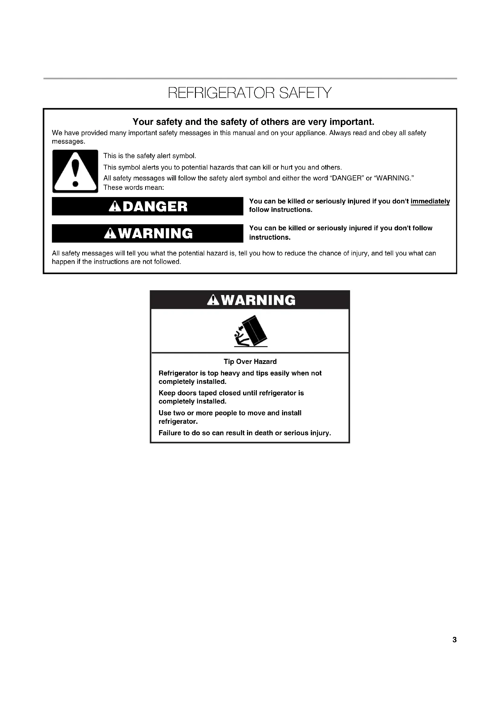³⁄₄" (1.9 cm) WARNING Tip Over Hazard Refrigerator is top heavy and tips easily when not completely installed. Keep doors taped closed until refrigerator is completely installed. Use two or more people to move and install refrigerator. Failure to do so can result in death or serious injury. A B