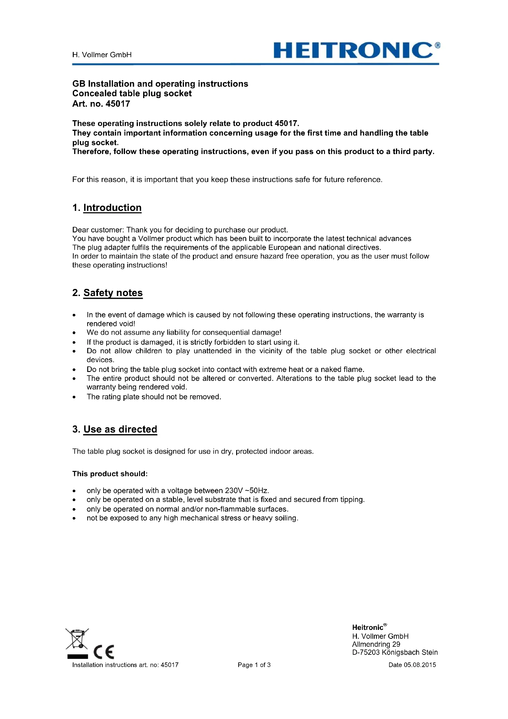 H. Vollmer GmbH Allmendring 29 D-75203 Königsbach SteinH. Vollmer GmbH Installation instructions art. no: 45017 Page 1 of 3 Date 05.08.2015 GB Installation and operating instructions Concealed table plug socket Art. no. 45017 These operating instructions solely relate to product 45017. They contain important information concerning usage for the first time and handling the table plug socket. Therefore, follow these operating instructions, even if you pass on this product to a third party. For this reason, it is important that you keep these instructions safe for future reference.