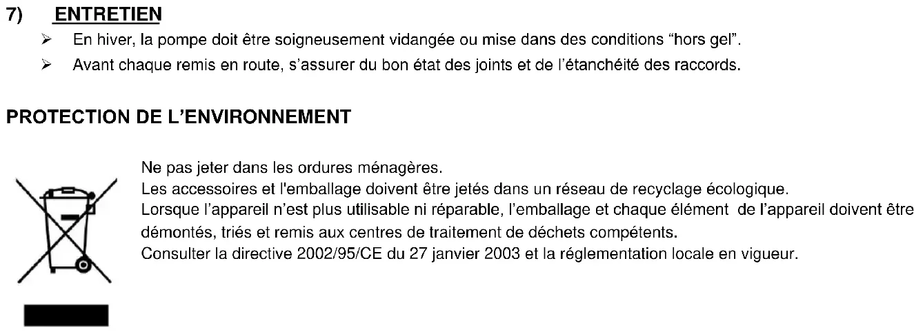 In winter, the pump should be thoroughly drained or kept in “frost free” conditions. Before each start-up, ensure that the seals are in good condition and that the connections are tight.