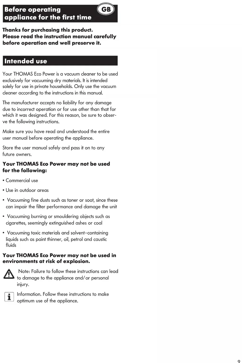 Your THOMAS Eco Power is a vacuum cleaner to be used exclusively for vacuuming dry materials. It is intended solely for use in private households. Only use the vacuum cleaner according to the instructions in this manual.