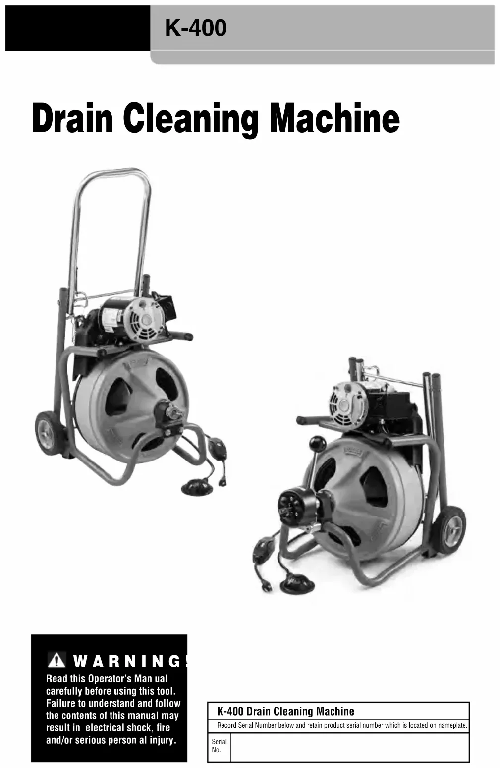- Have your power tool serviced by a qual - ified repair person using only identical replacement parts. This will ensure that the safety of the power tool is maintained. Specific Safety Information WARNING This section contains important safetyinformation that is specific to this tool.Read these precautions carefully be-fore using the K-400 Drain CleaningMachine to reduce the risk of electricalshock or other serious personal injury. SAVE THESE INSTRUCTIONS! Keep this manual with the machine for use by the operator. The manual can be hung on the machine. Transportable Drain Cleaner Safety Warnings