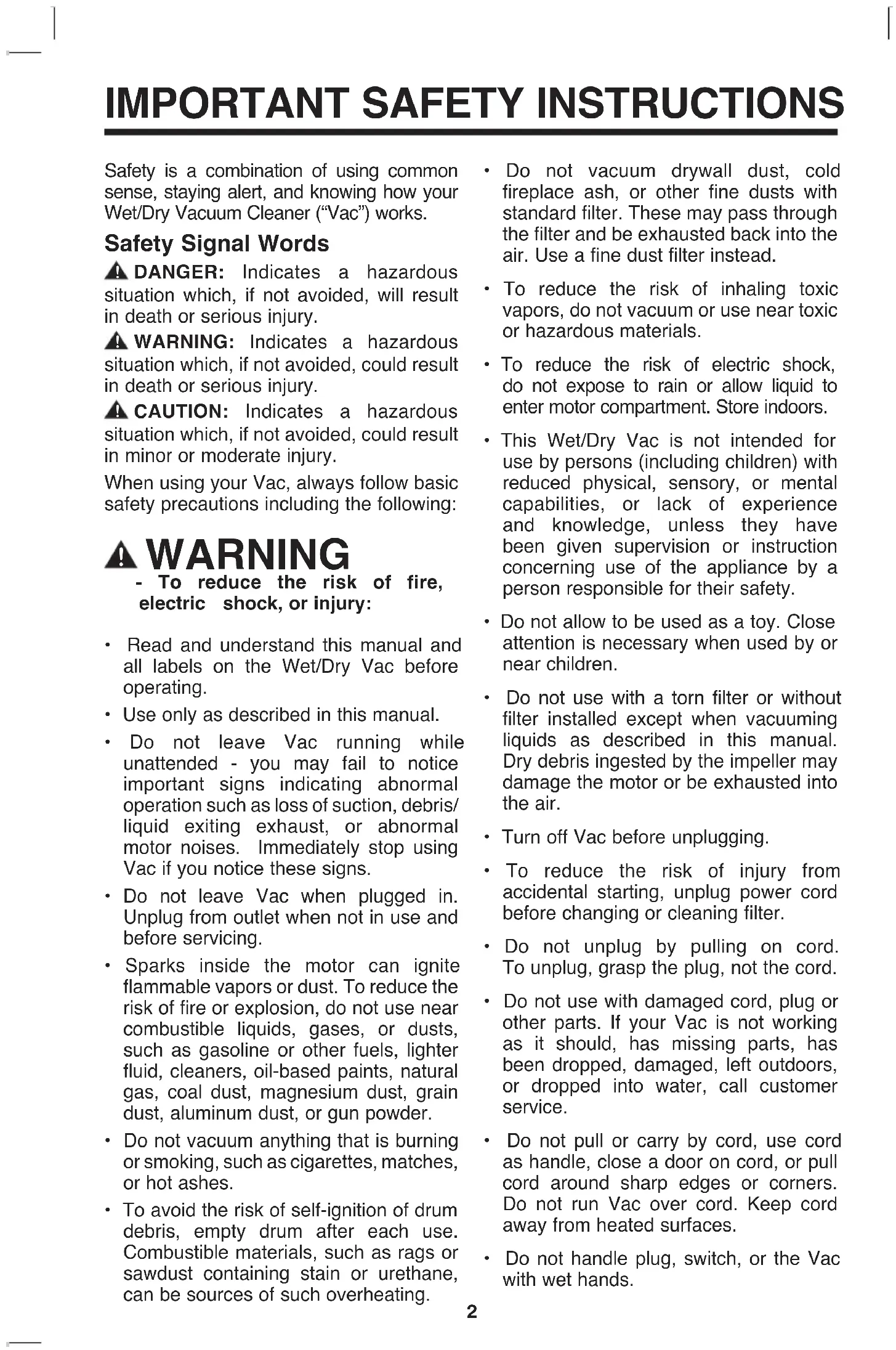 Safety is a combination of using common sense, staying alert, and knowing how your Wet/Dry Vacuum Cleaner (“Vac”) works. Safety Signal Words