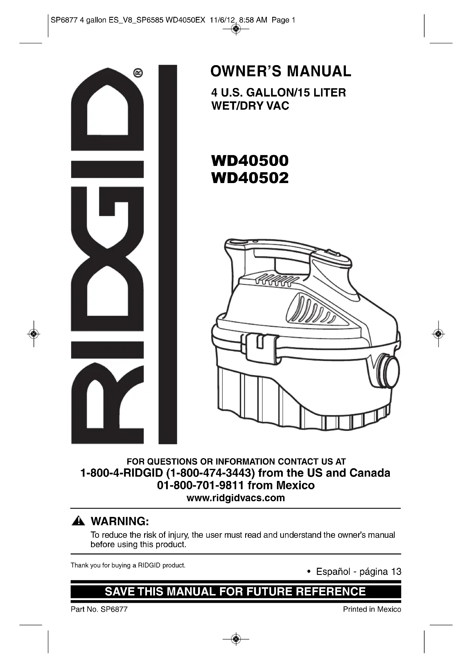 Wet/Dry Vacs. No employee, agent, dealer, or other person is authorized to alter this warranty or make any other warranty on behalf of Ridge Tool Company. FOR QUESTIONS OR INFORMATION CONTACT US AT 1-800-4-RIDGID (1-800-474-3443) from the US and Canada 01-800-701-9811 from Mexico www.ridgidvacs.com Please have your Model Number and Serial Number on hand when calling. SP6877 4 gallon ES_V8_SP6585 WD4050EX 11/6/12 8:58 AM Page 12WD40500 WD40502