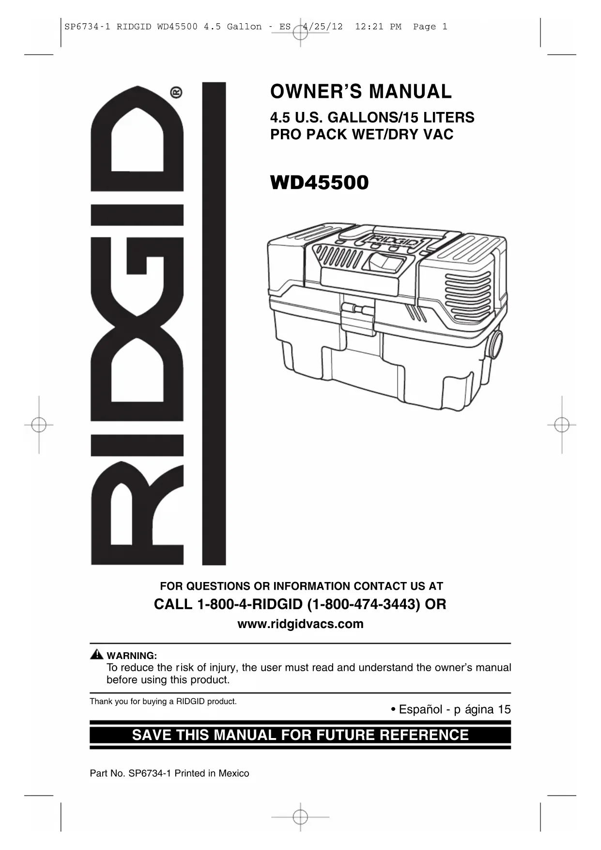 ead this owner’s manual to familiarize yourself with the product features and to understand the specific usage of your new Vac. SP6734-1 RIDGID WD45500 4.5 Gallon - ES 4/25/12 12:21 PM Page 45 Getting to Know Your Vac